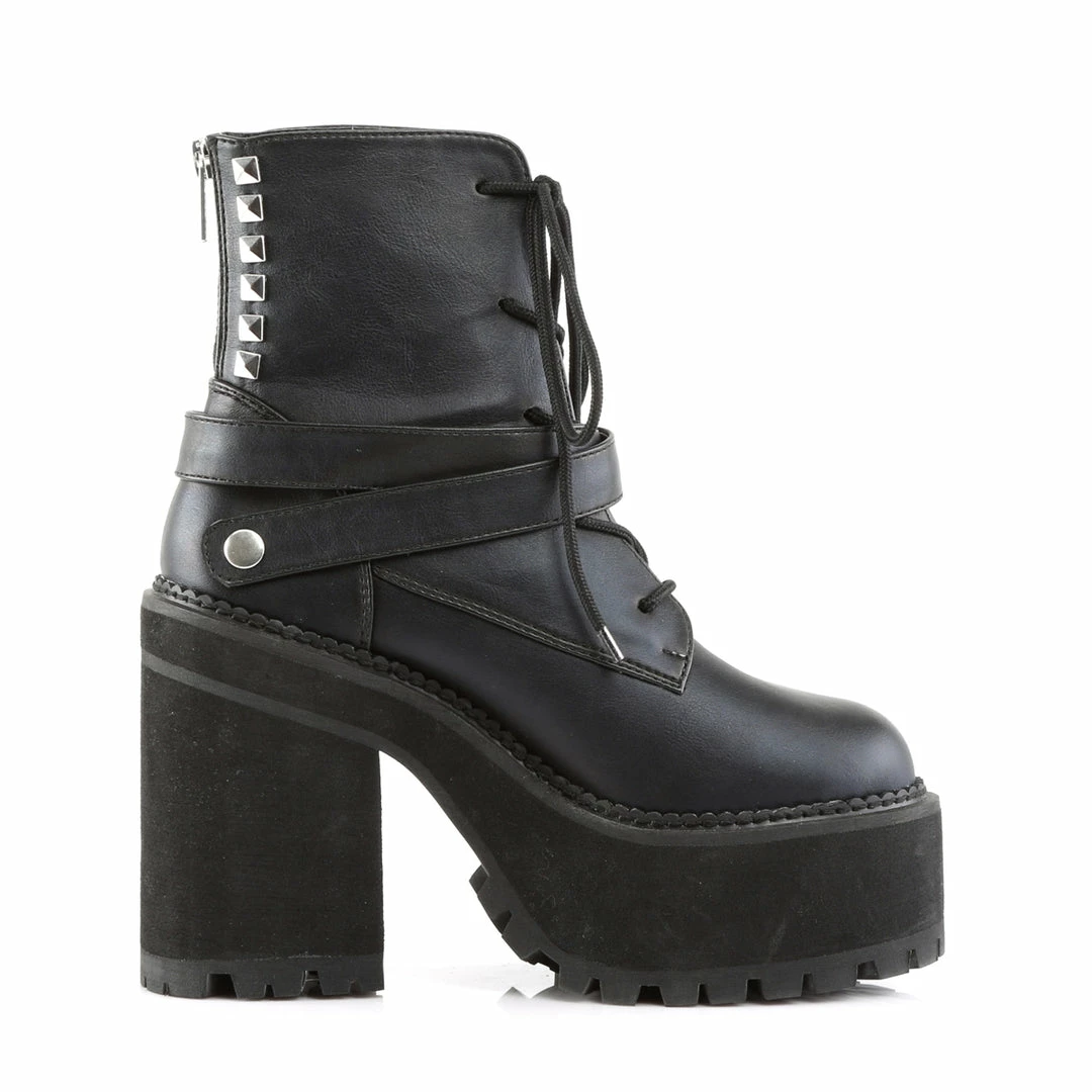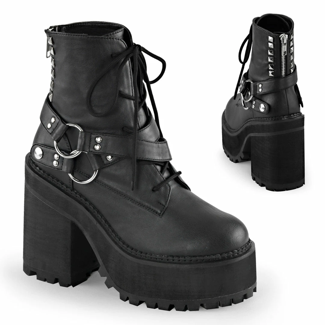 4 3/4″ (12.1cm) block heel, 2 1/4″ (5.7cm) cleated platform lace up front ankle boot with wrap around snap on strap with double d-rings at outer side, half studded back zip closure.