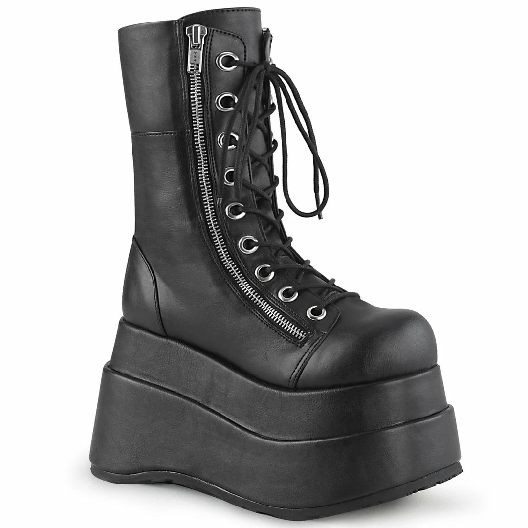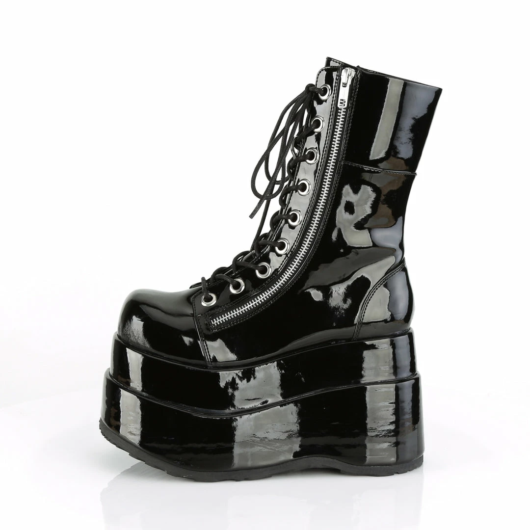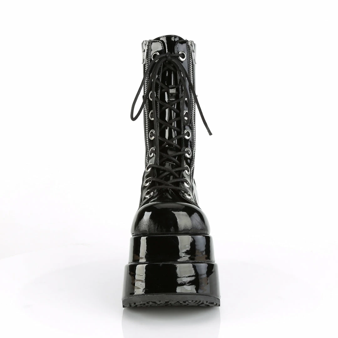 4 1/2″ (11.4cm) Tiered platform lace up front mid-calf boot featuring outer and inner metal zip closure.