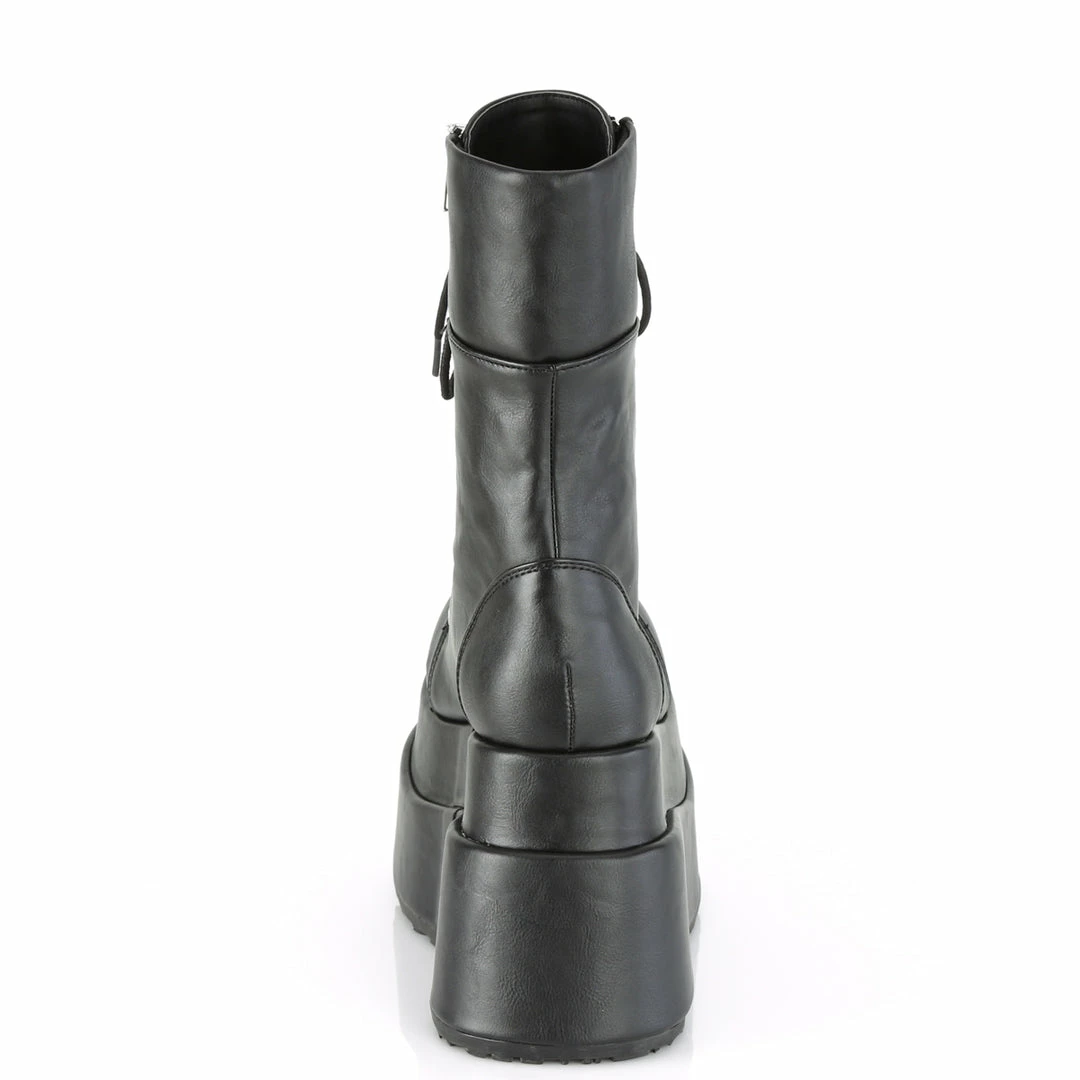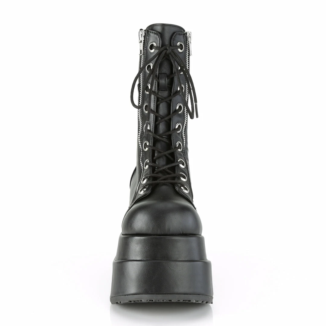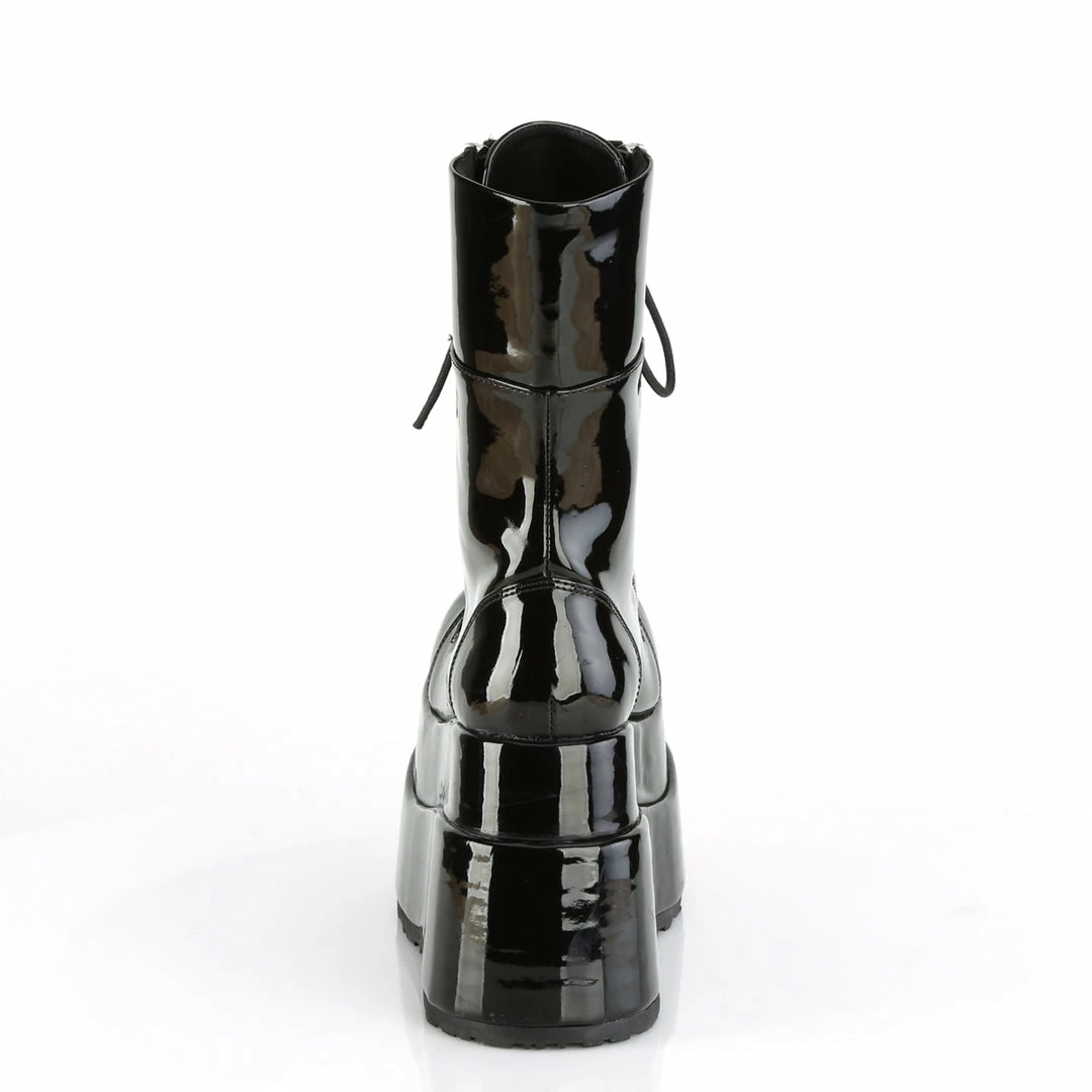 4 1/2″ (11.4cm) Tiered platform lace up front mid-calf boot featuring outer and inner metal zip closure.