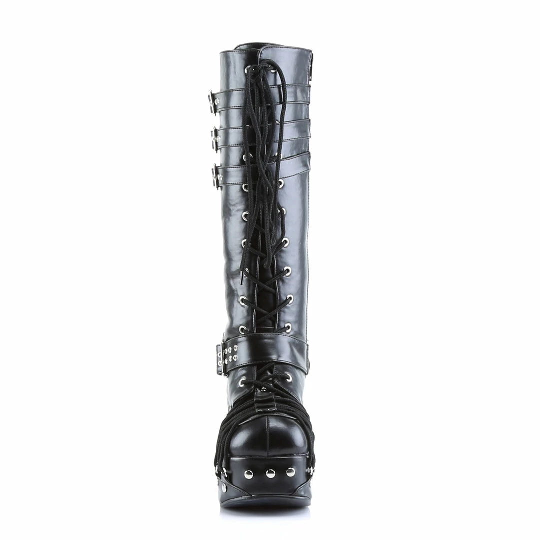 4 1/2″ (11.4cm) block heel, 2″ (5.1cm) platform Goth Punk Lolita corset style lace-up knee boot with buckles, studs and straps on platform, heel and upper. Full inner side zip.