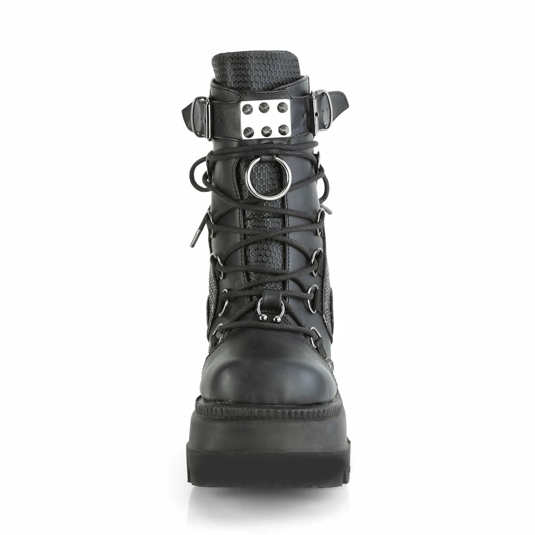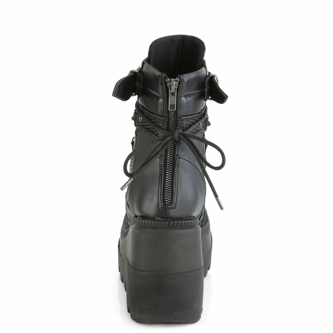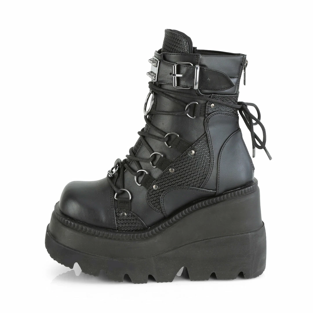 4 1/2″ (11.4cm) Wedge platform lace-up dual buckle ankle boot featuring studded contrast panels and pewter tone hardware on the front centre vamp that includes horseshoe ring, spike studded metal plate and large O-ring with metal back zip closure.