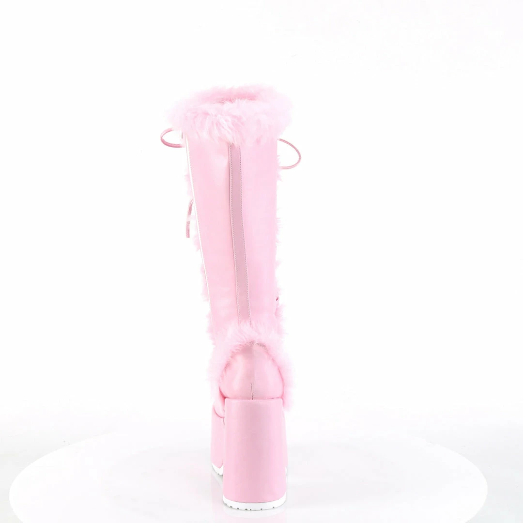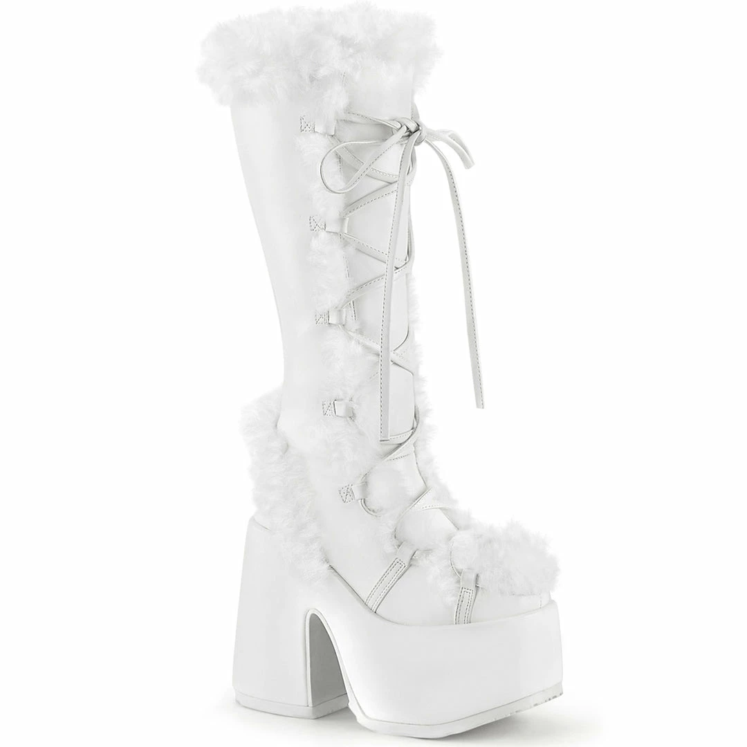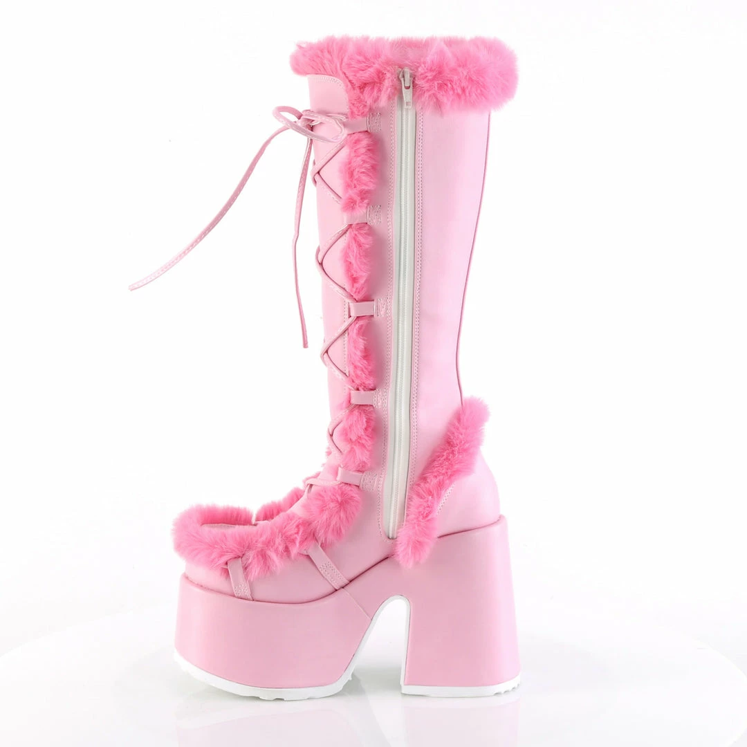5″ (12.7mm) chunky heel, 3″ (7.5cm) platform lace-up knee high boot featuring faux fur trim detail and full inner side zipper.