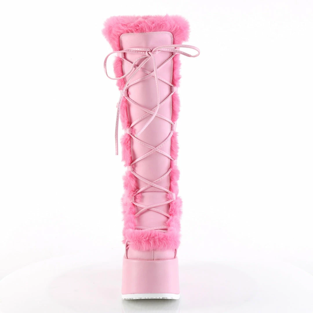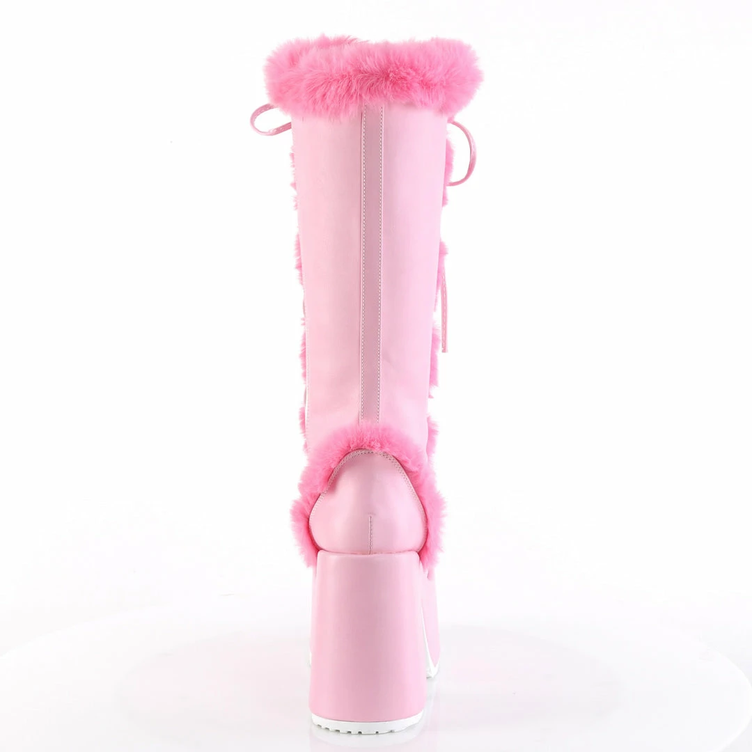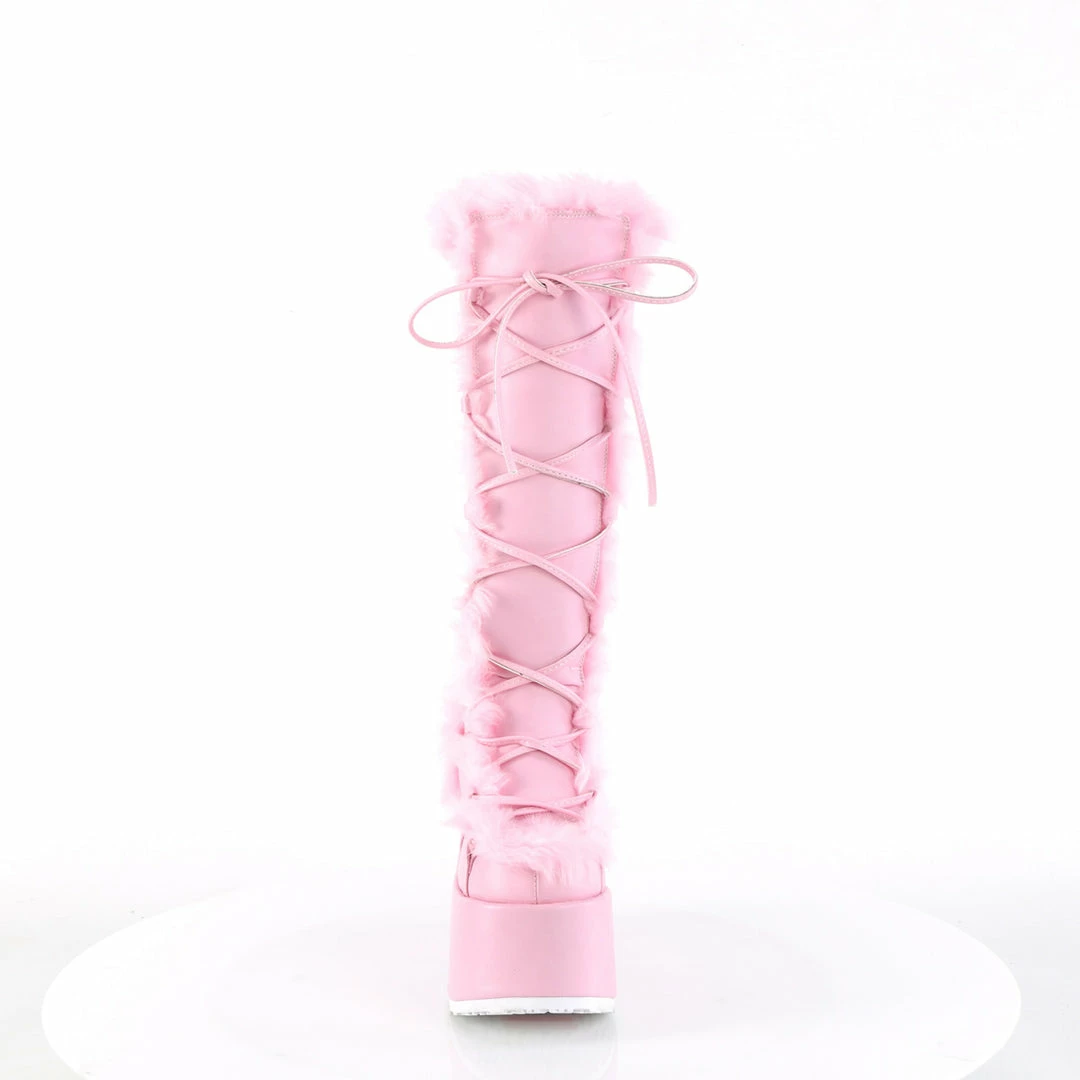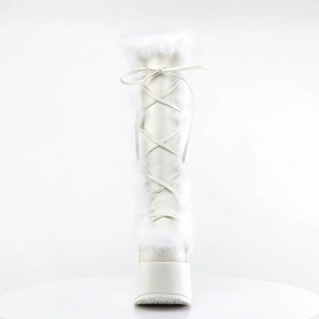 5″ (12.7mm) chunky heel, 3″ (7.5cm) platform lace-up knee high boot featuring faux fur trim detail and full inner side zipper.