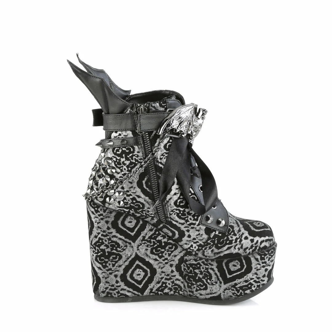 5″ (12.7cm) Platform wedge lace up front ankle bootie featuring wrap around studded & spike straps with bat buckle detail, chain with various hanging charms & batwing detail up the back. Inside metal zip closure.