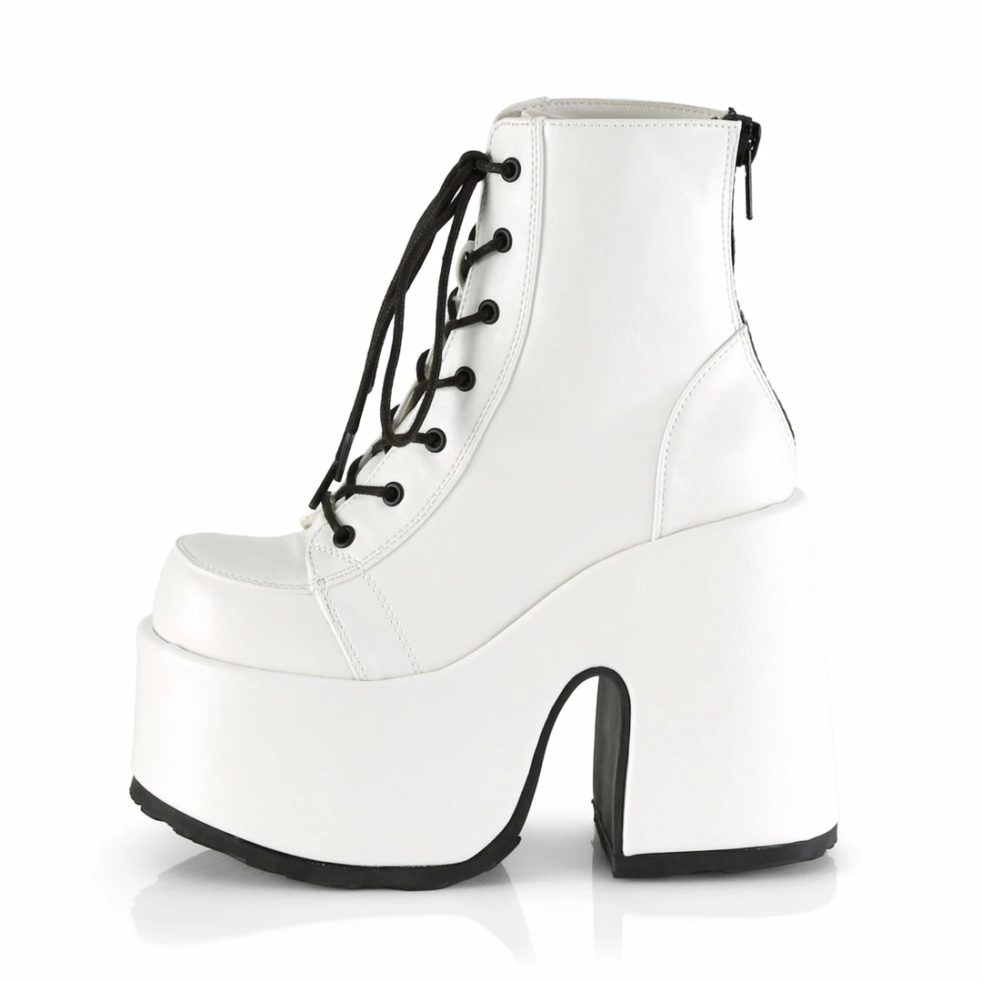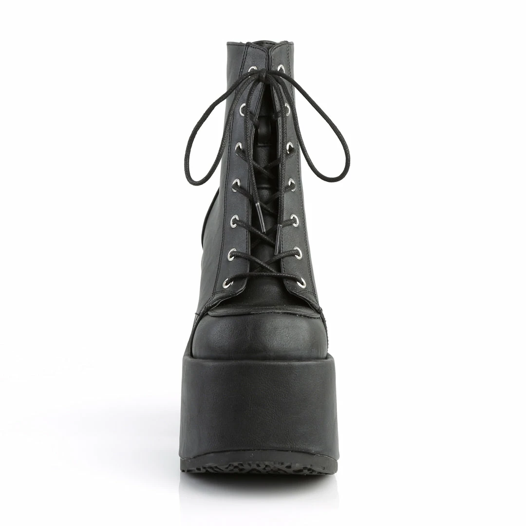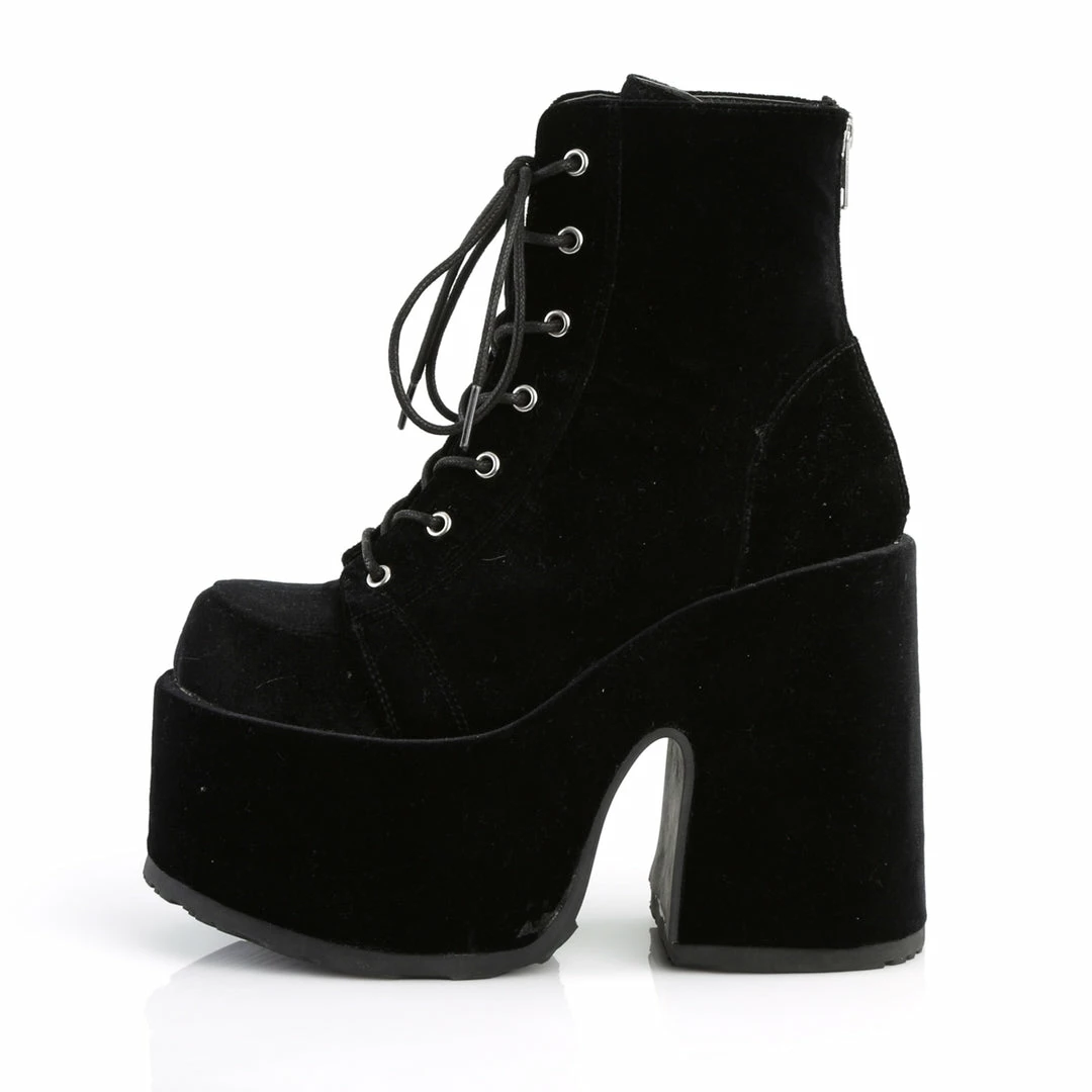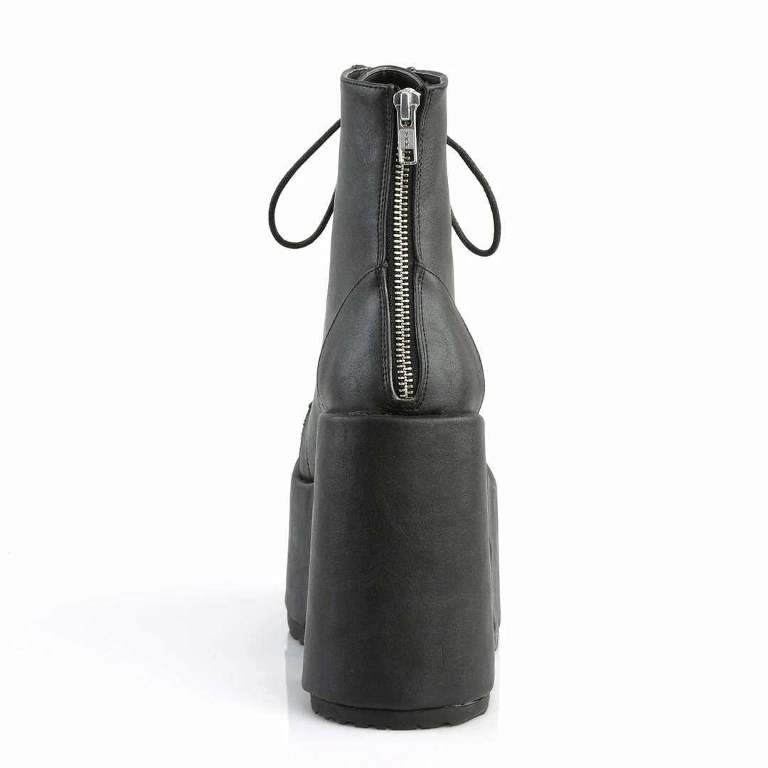 5″ (12.7mm) chunky heel, 3″ (7.5cm) platform lace-up ankle boot with back metal zip closure.