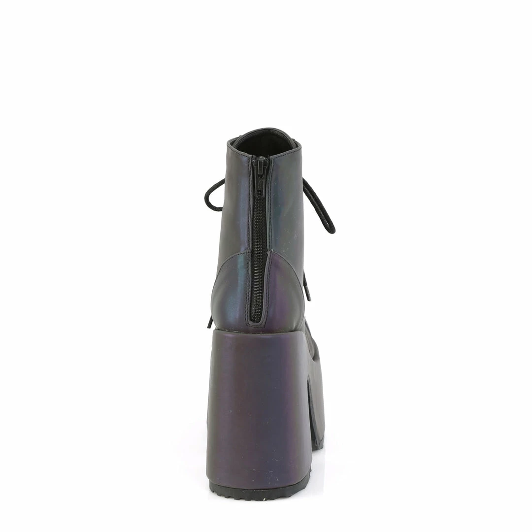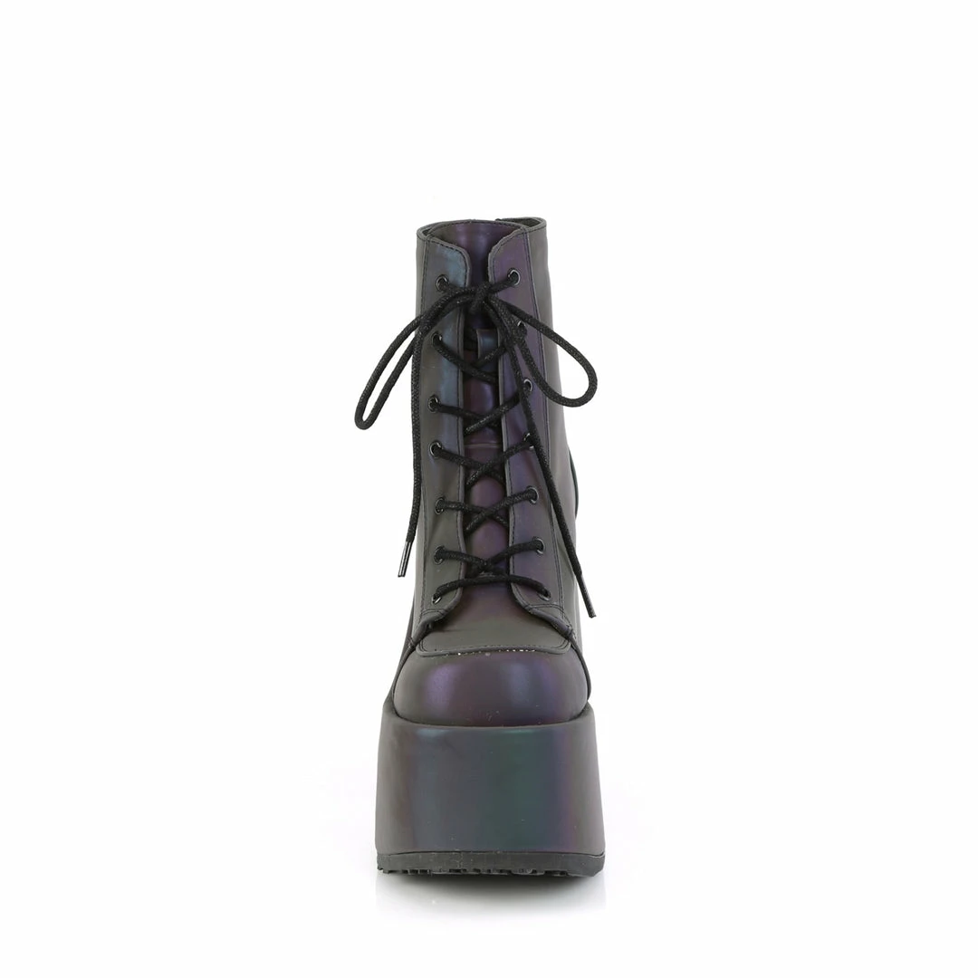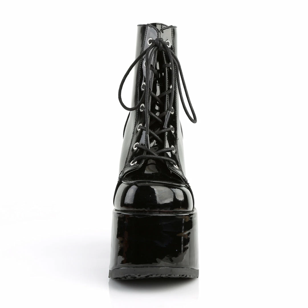 5″ (12.7mm) chunky heel, 3″ (7.5cm) platform lace-up ankle boot with back metal zip closure.