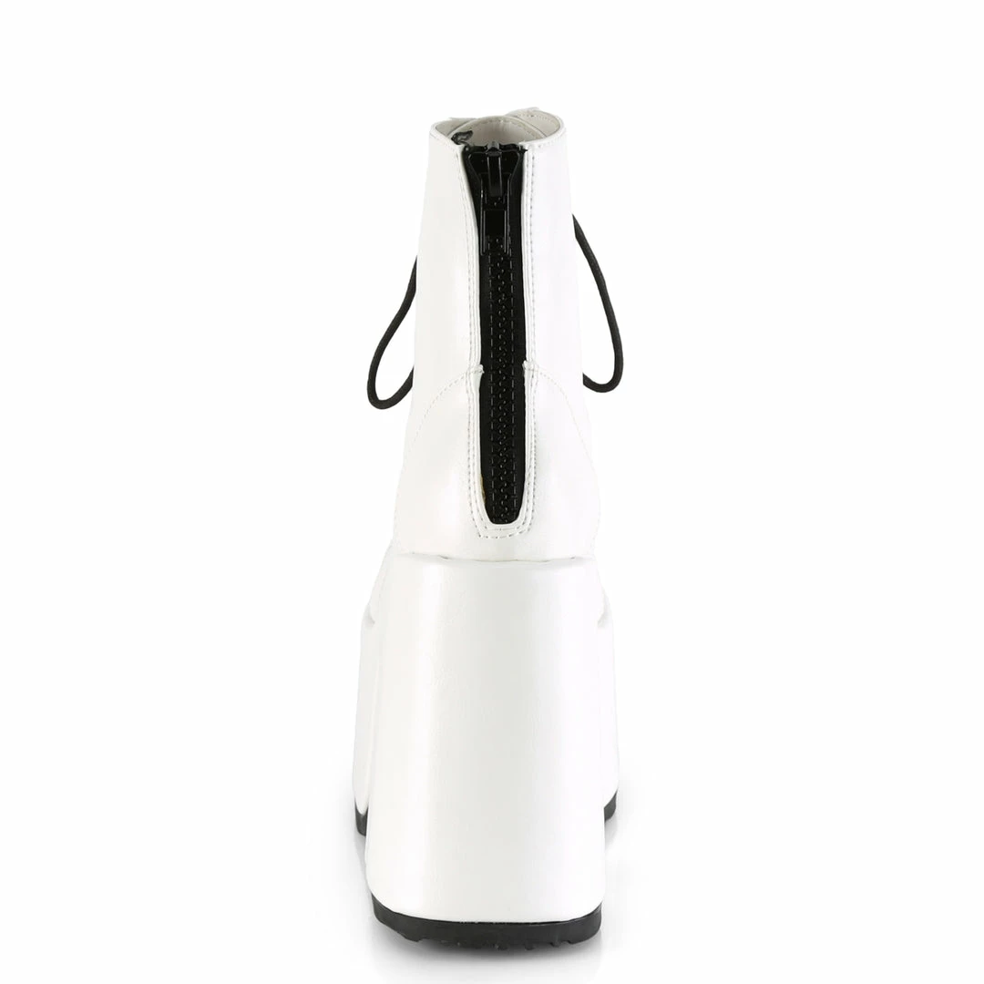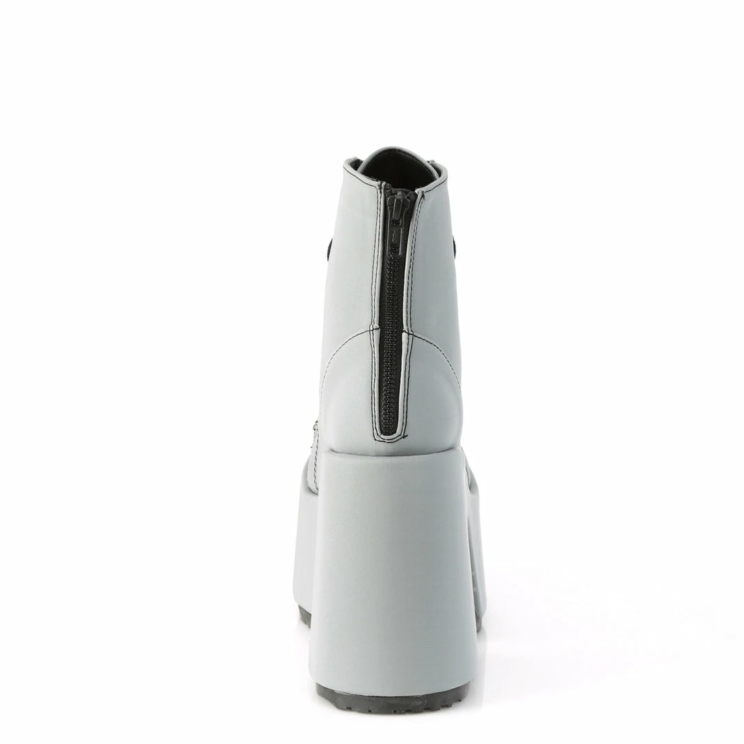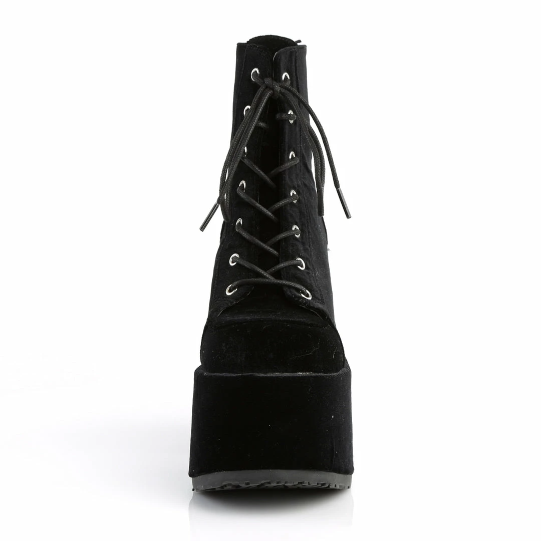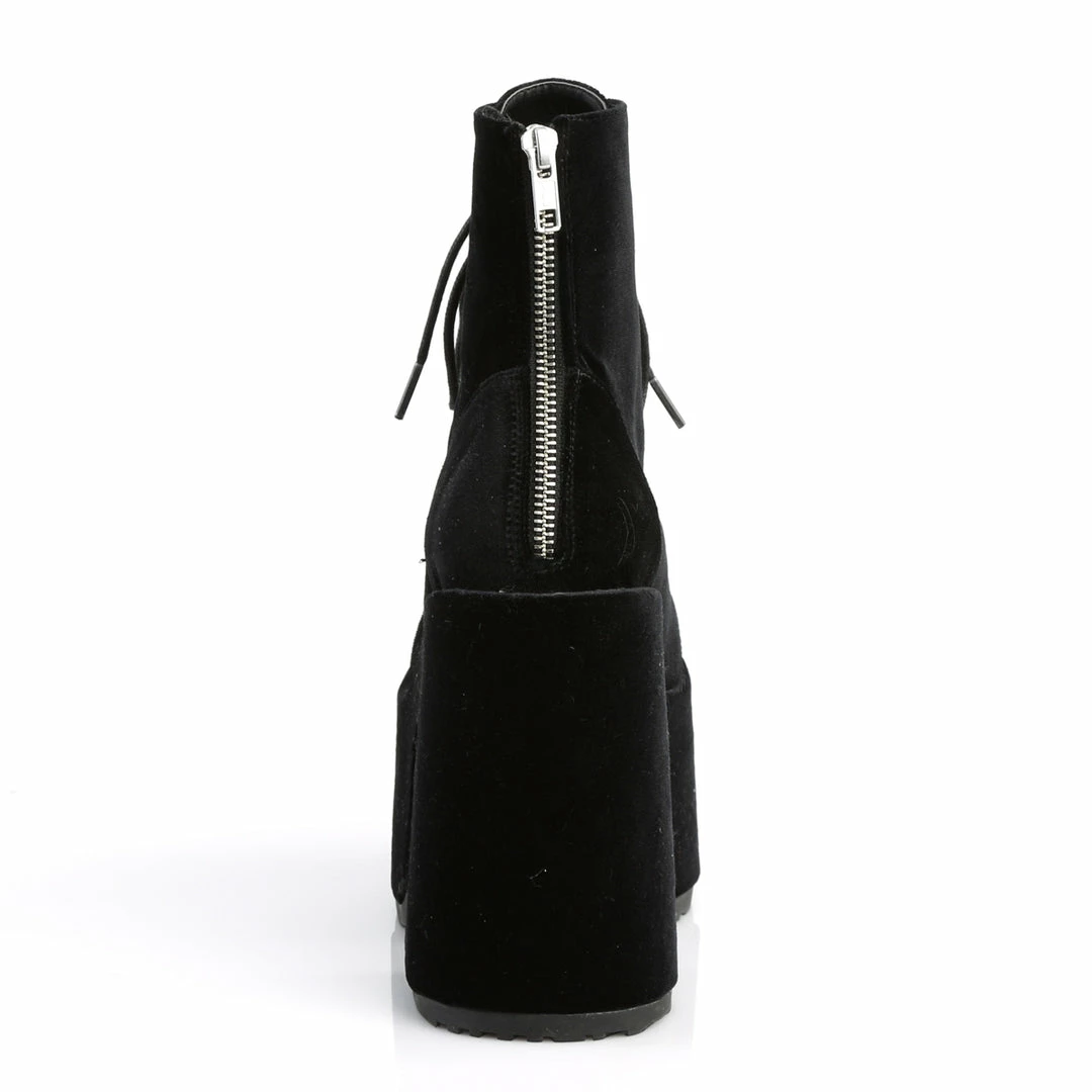 5″ (12.7mm) chunky heel, 3″ (7.5cm) platform lace-up ankle boot with back metal zip closure.