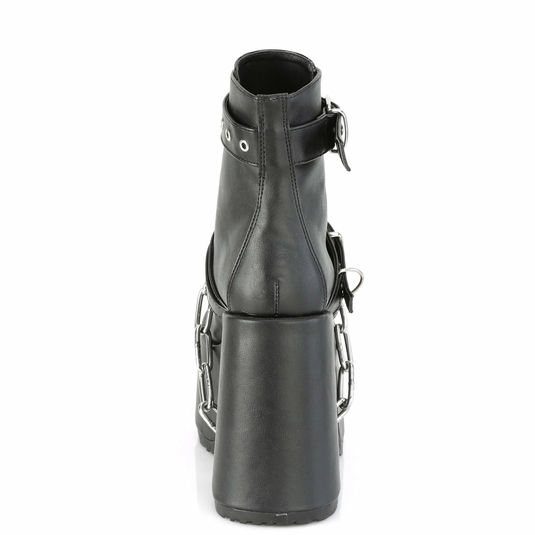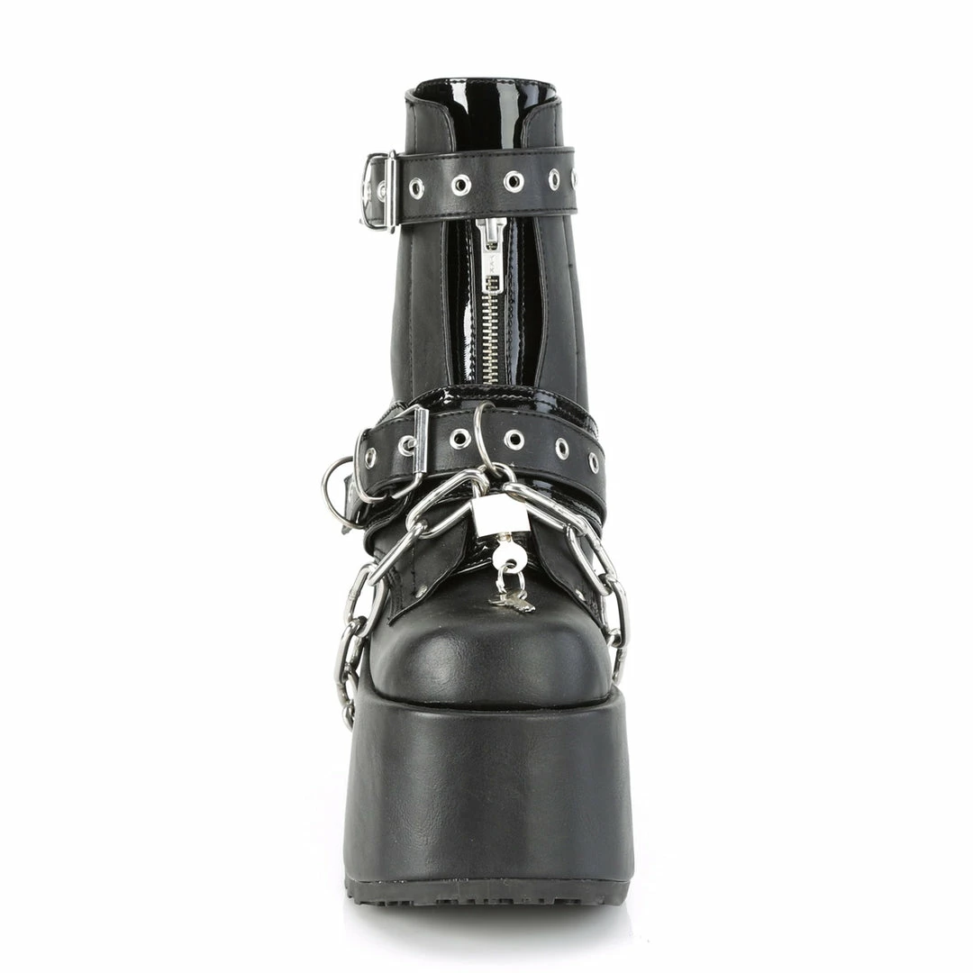 5″ (12.7mm) chunky heel, 3″ (7.5cm) platform ankle boot with metal front zip closure featuring top and lower buckle strap with eyelets, d-ring and chrome metal plated padlock with thick metal chain draped through platform and heel channel.