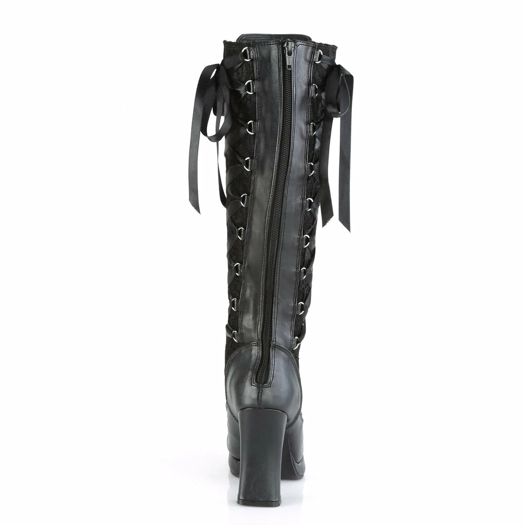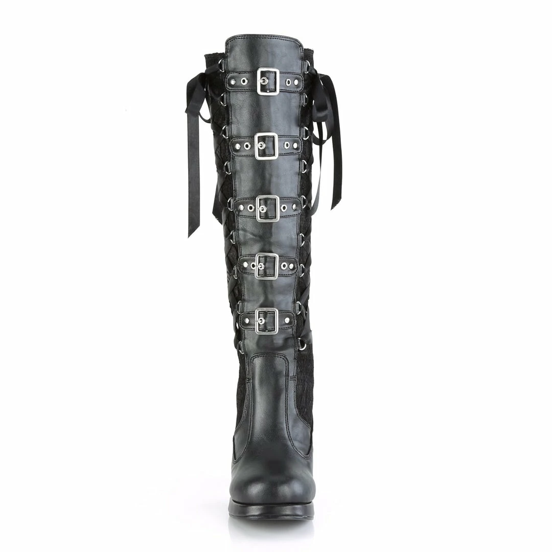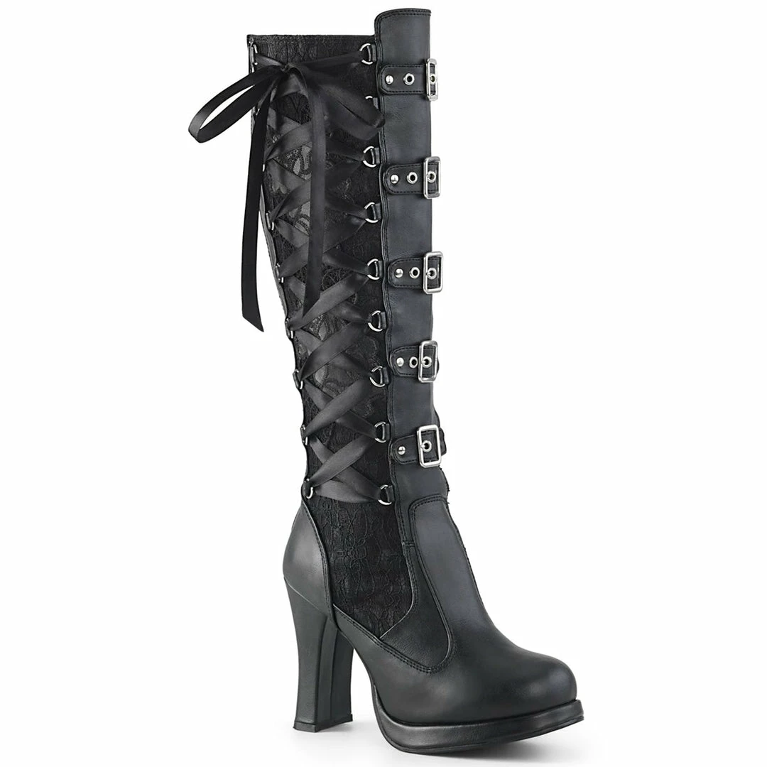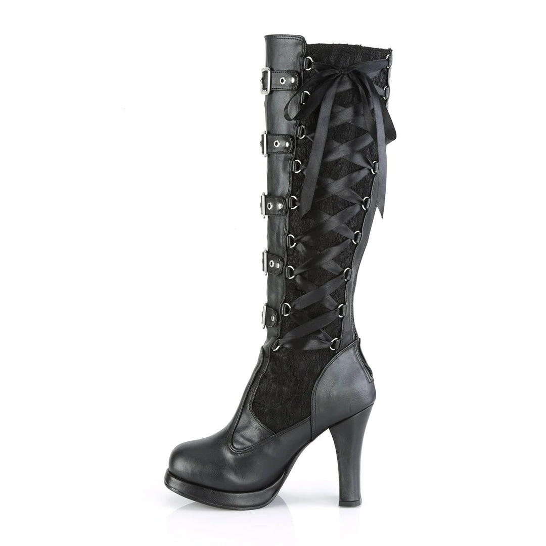 4″ (10.2cm) heel, 3/4″ (1.9cm) platform goth punk Lolita corseted 5 buckle knee boot with full inner side zipper.