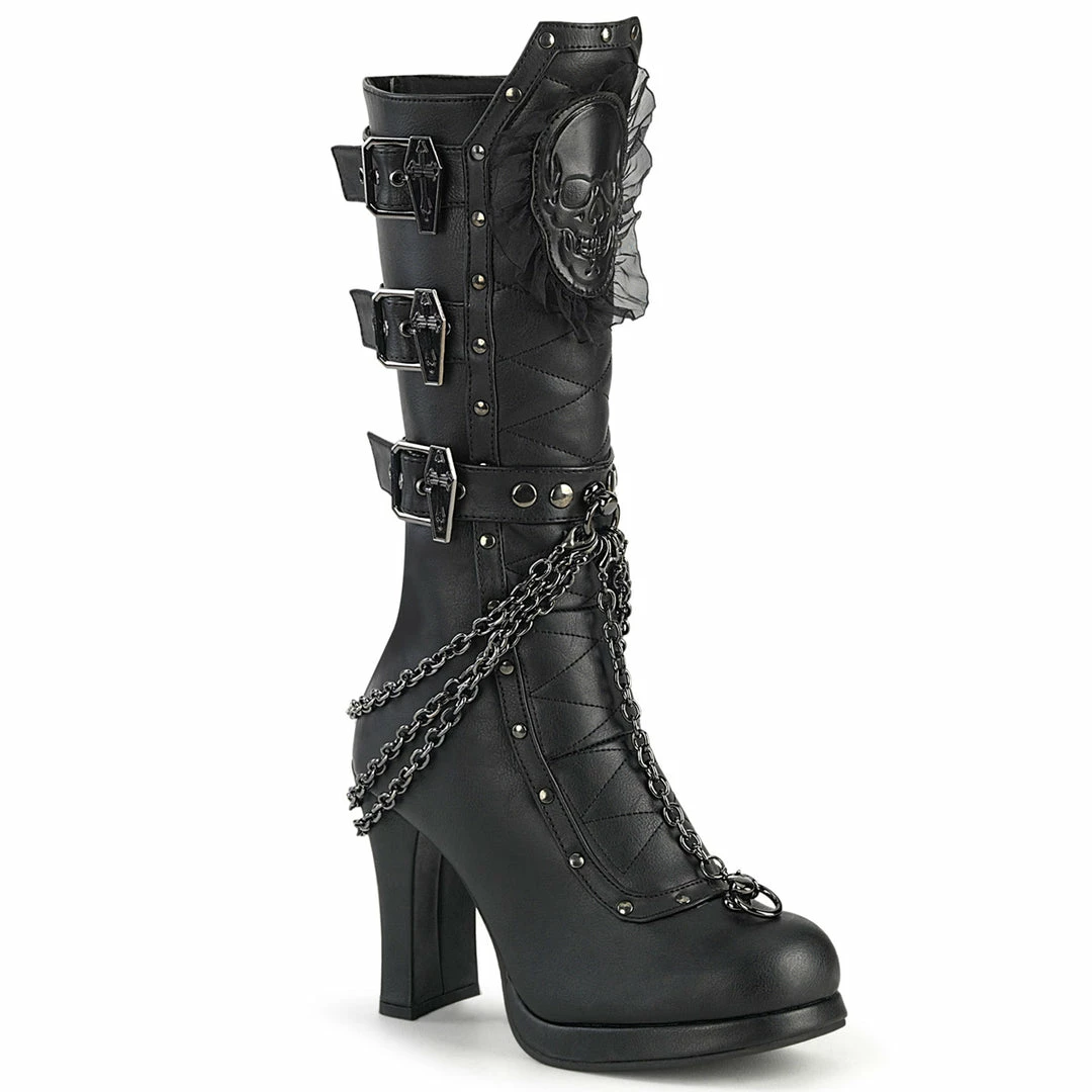 4″ (10.2cm) block heel, 3/4″ (1.9cm) platform mid-calf boot with coffin buckle, skull patch & lace embellished quilted front panel with studs & swivel hook cascading chain detail and metal back zip closure