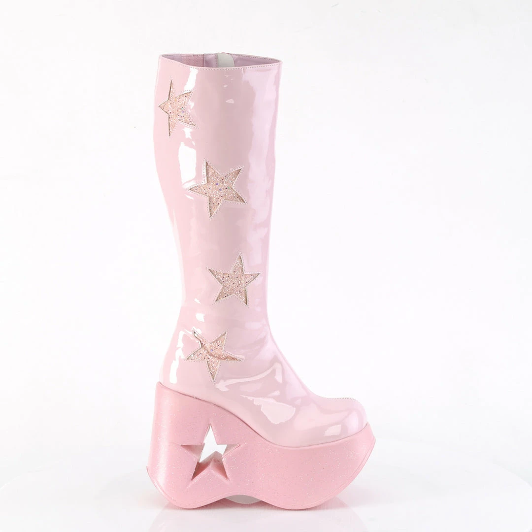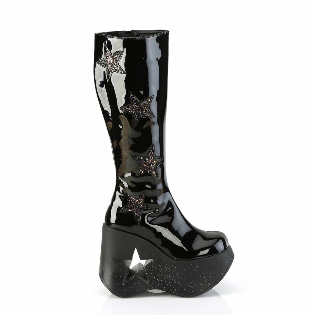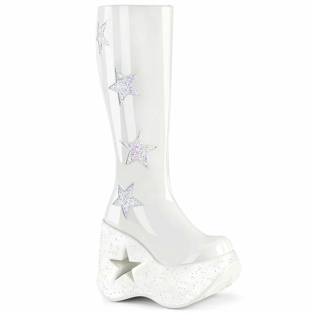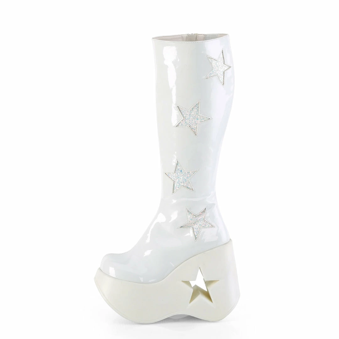 5″ (12.7mm) Star cut-out platform wedge knee high boot featuring glitter star details on the outer shaft and mini iridescent glitter on the entire platform bottom. Inner side metal zip closure.