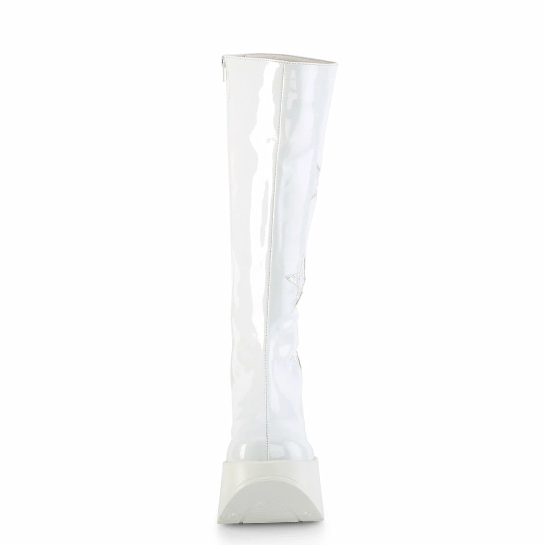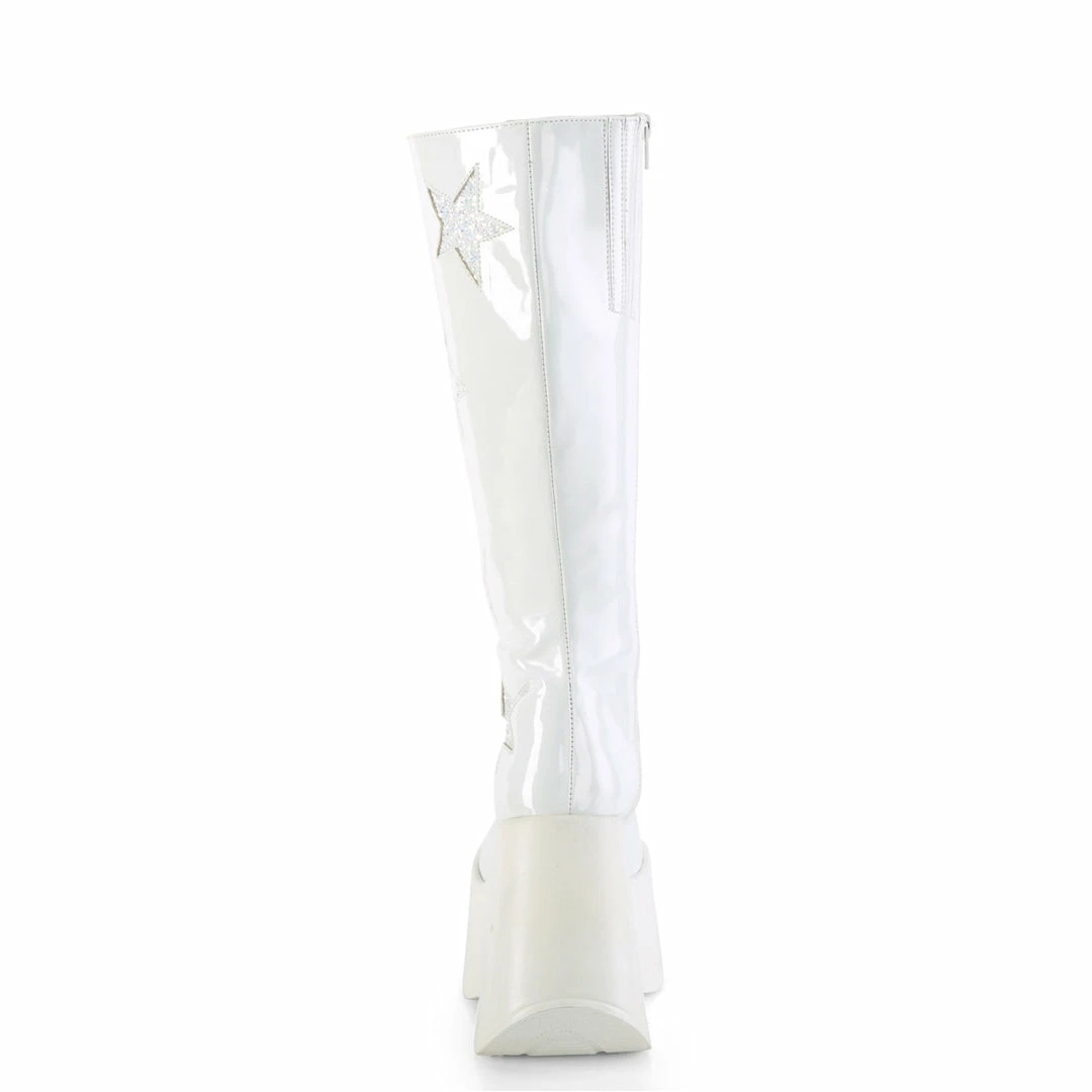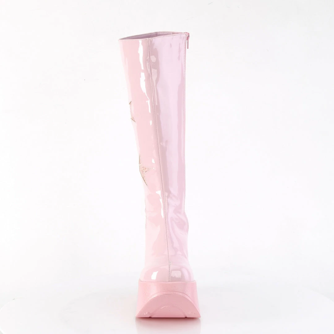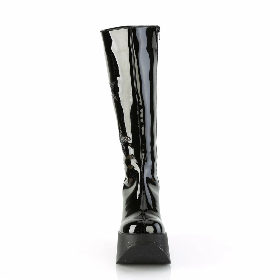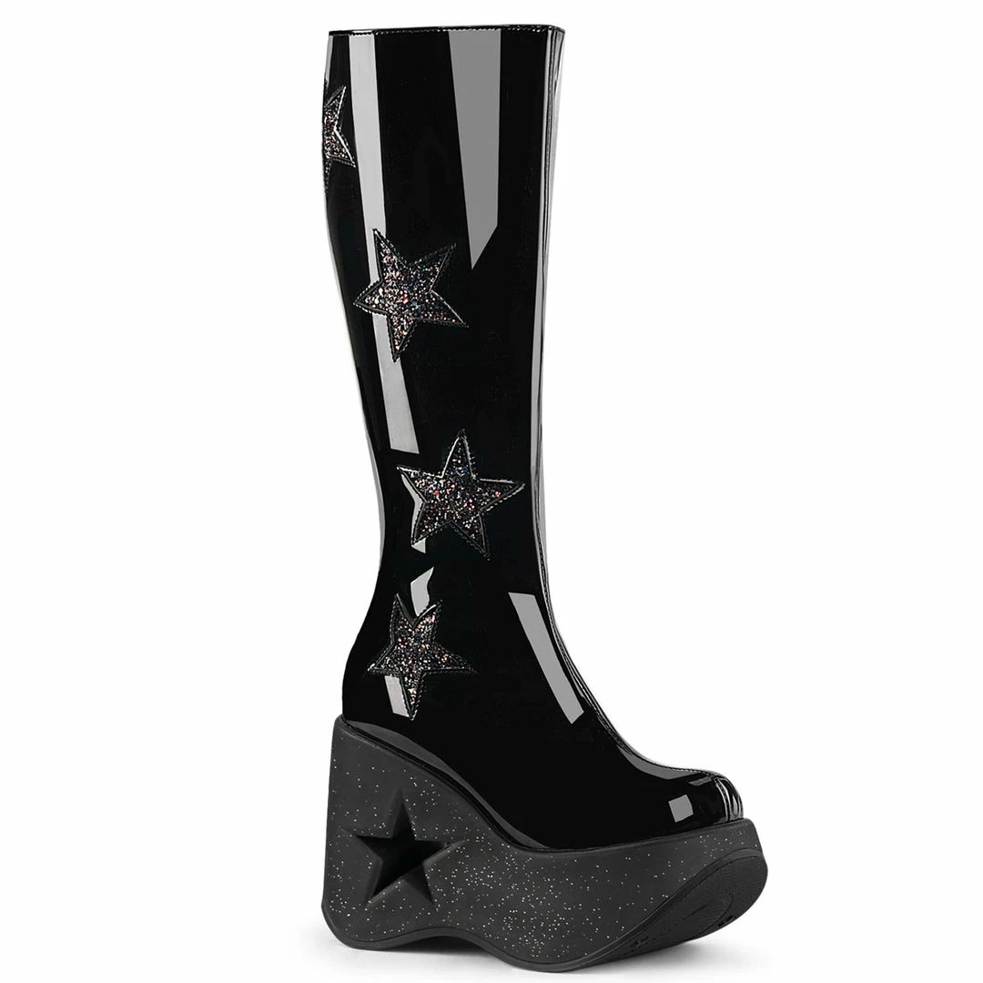 5″ (12.7mm) Star cut-out platform wedge knee high boot featuring glitter star details on the outer shaft and mini iridescent glitter on the entire platform bottom. Inner side metal zip closure.