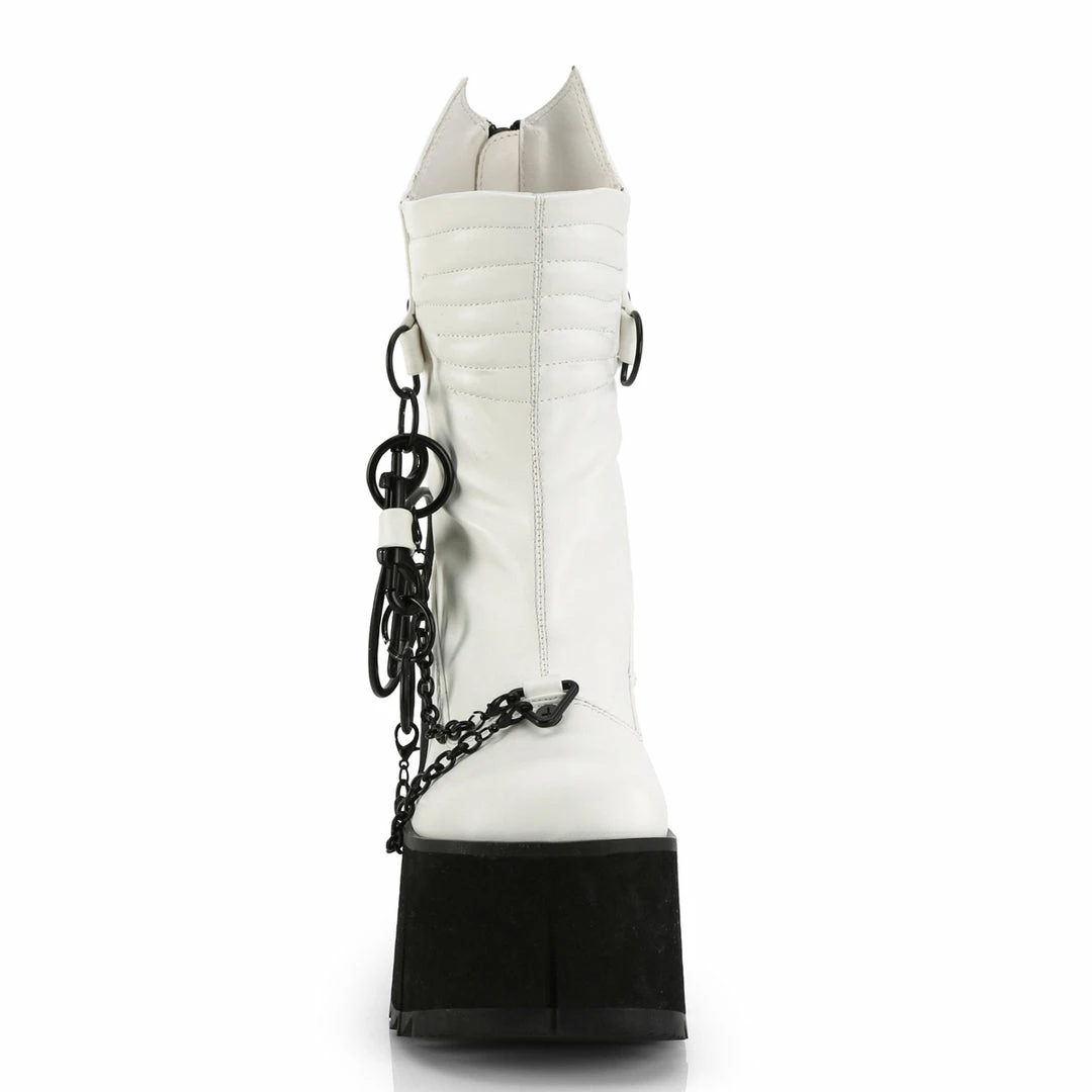 4 1/2″ (11.4cm)Β platformΒ calf high boot featuring screw studs, quilting and various O-ring, D-ring and triangle rings with hanging chain detail.Β Back metal zip closure.