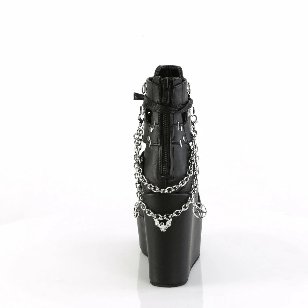 5″ (12.7cm) Platform wedge peep toe lace-up cage ankle bootie featuring silver tone metal staple accents, studs, d-rings and removable back chains with pentagram & bat charms. Metal back zip closure.