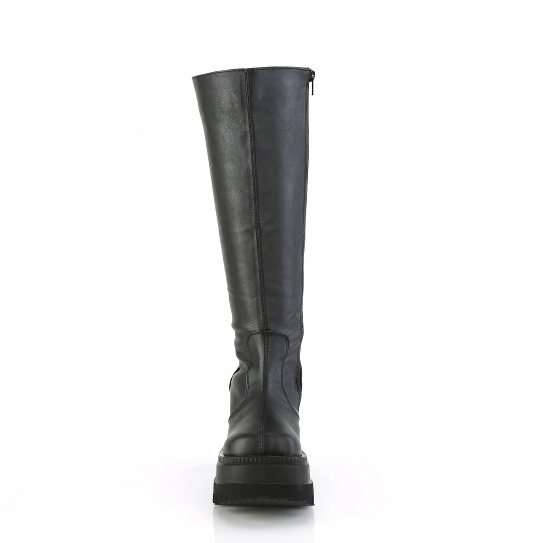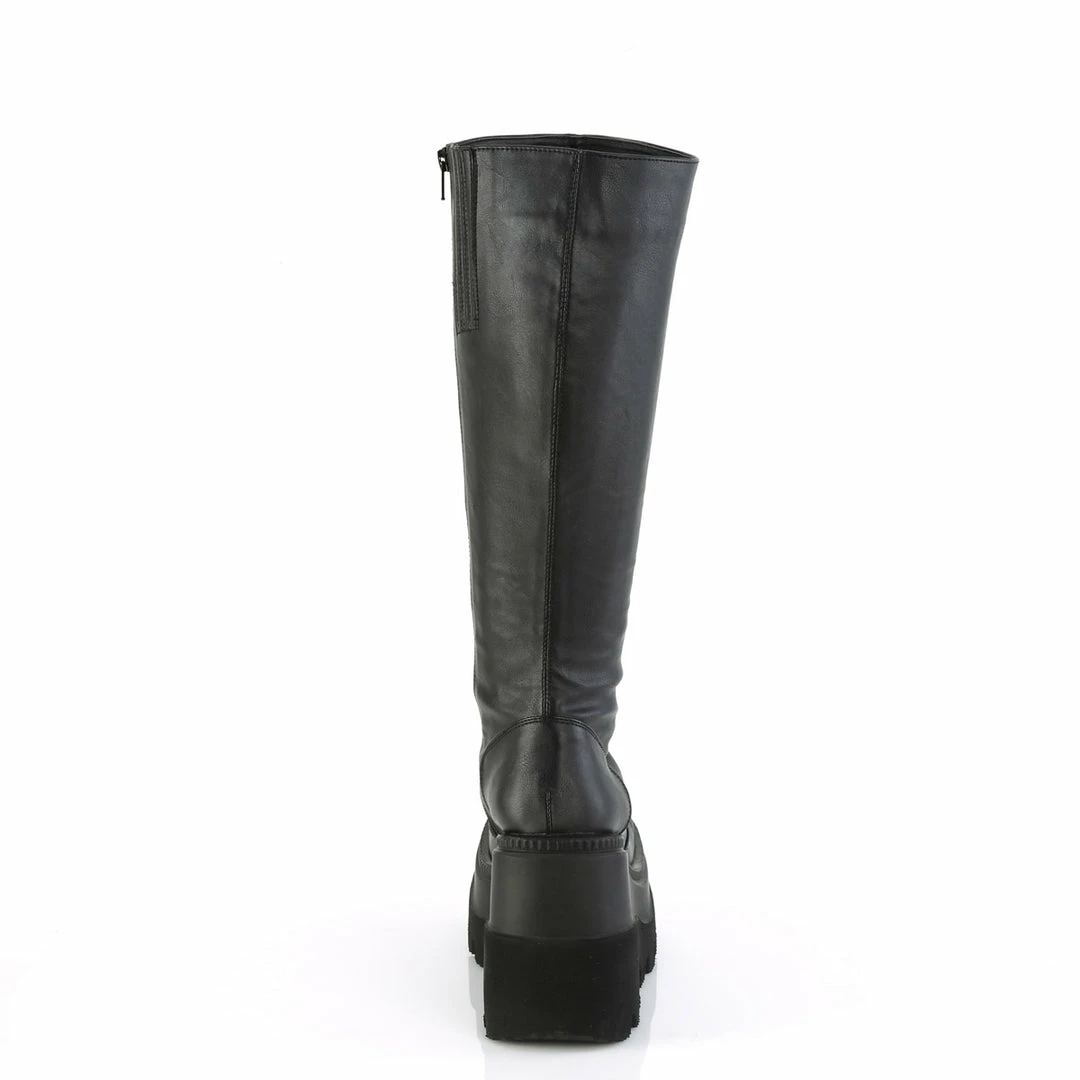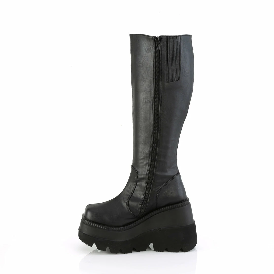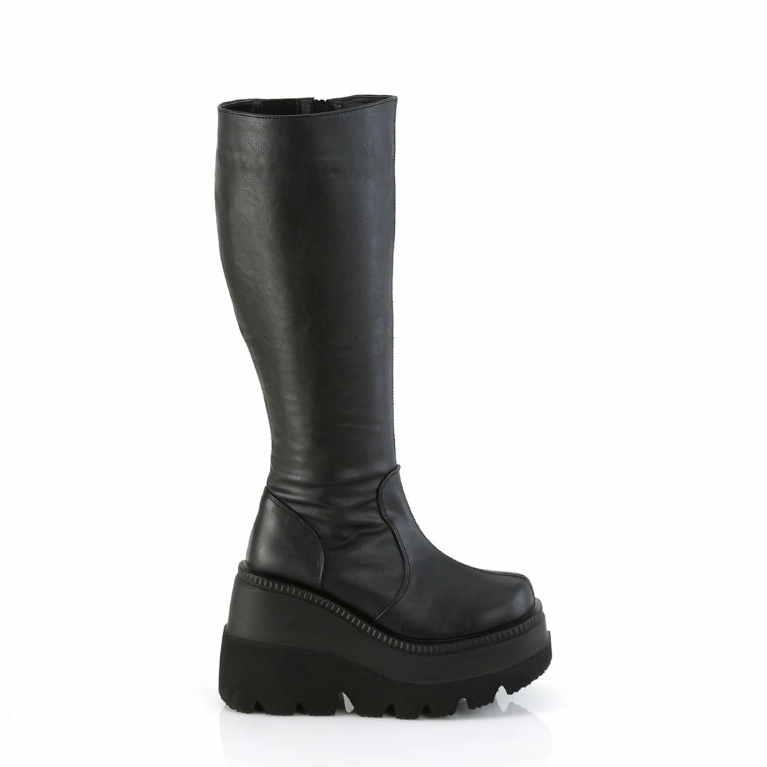 4 1/2″ (11.4cm) Wedge platform wide calf-knee high boot with full length inner side zip closure.