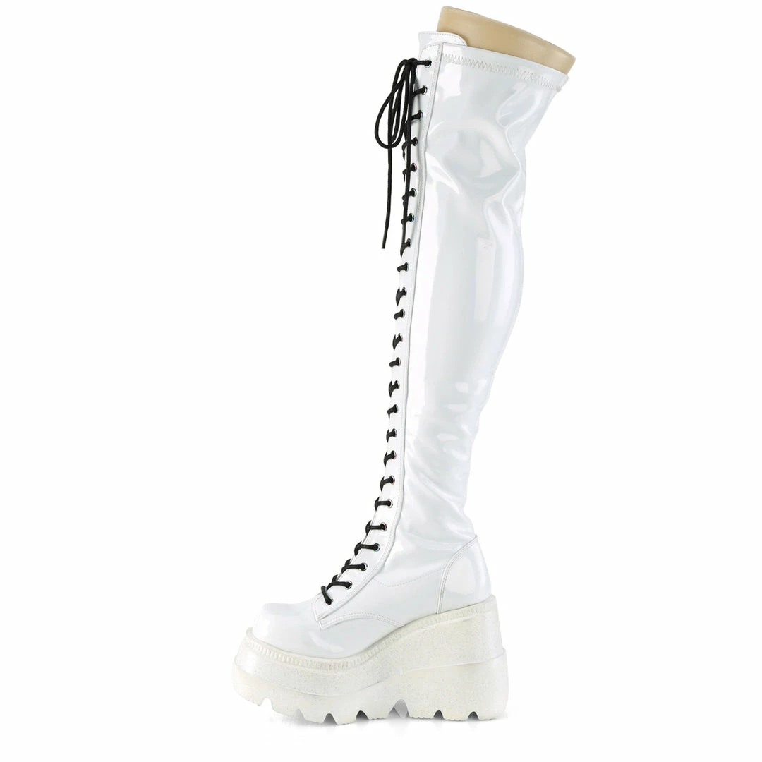 4 1/2″ (11.4cm) Wedge platform lace-up stretch thigh high boot with full length outside metal zipper.