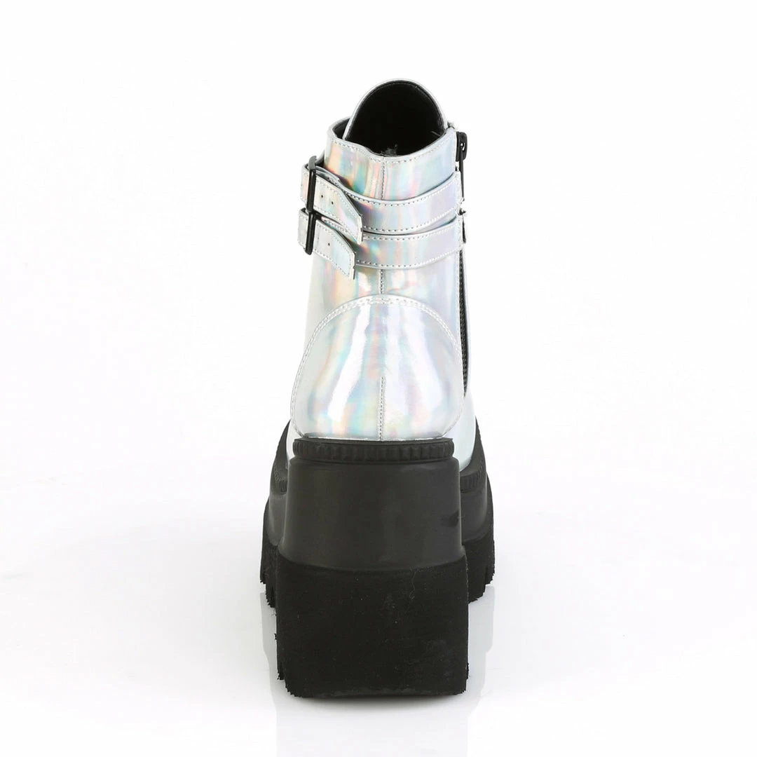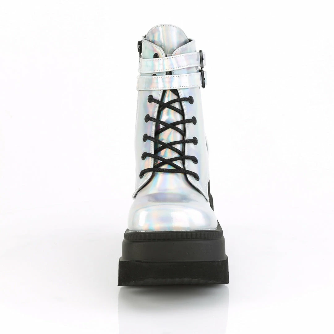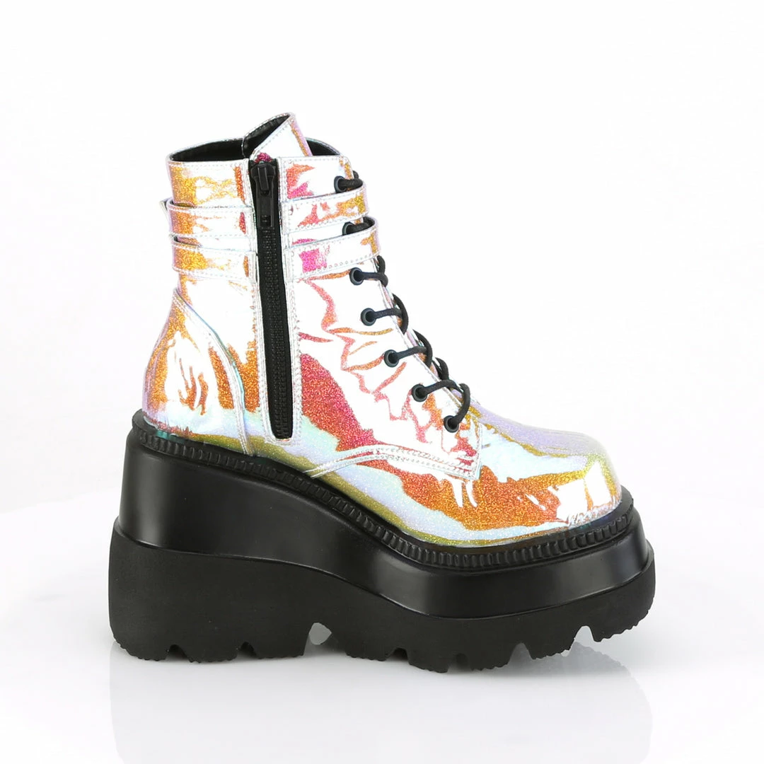 4 1/2″ (11.4cm) Wedge platform lace-up front ankle boot with double buckled ankle straps and inside zip closure.