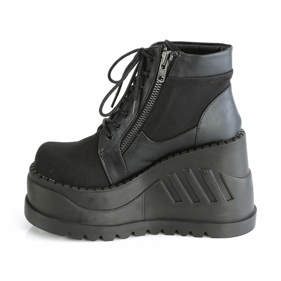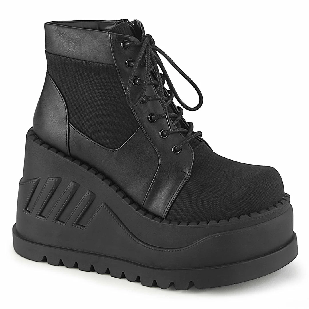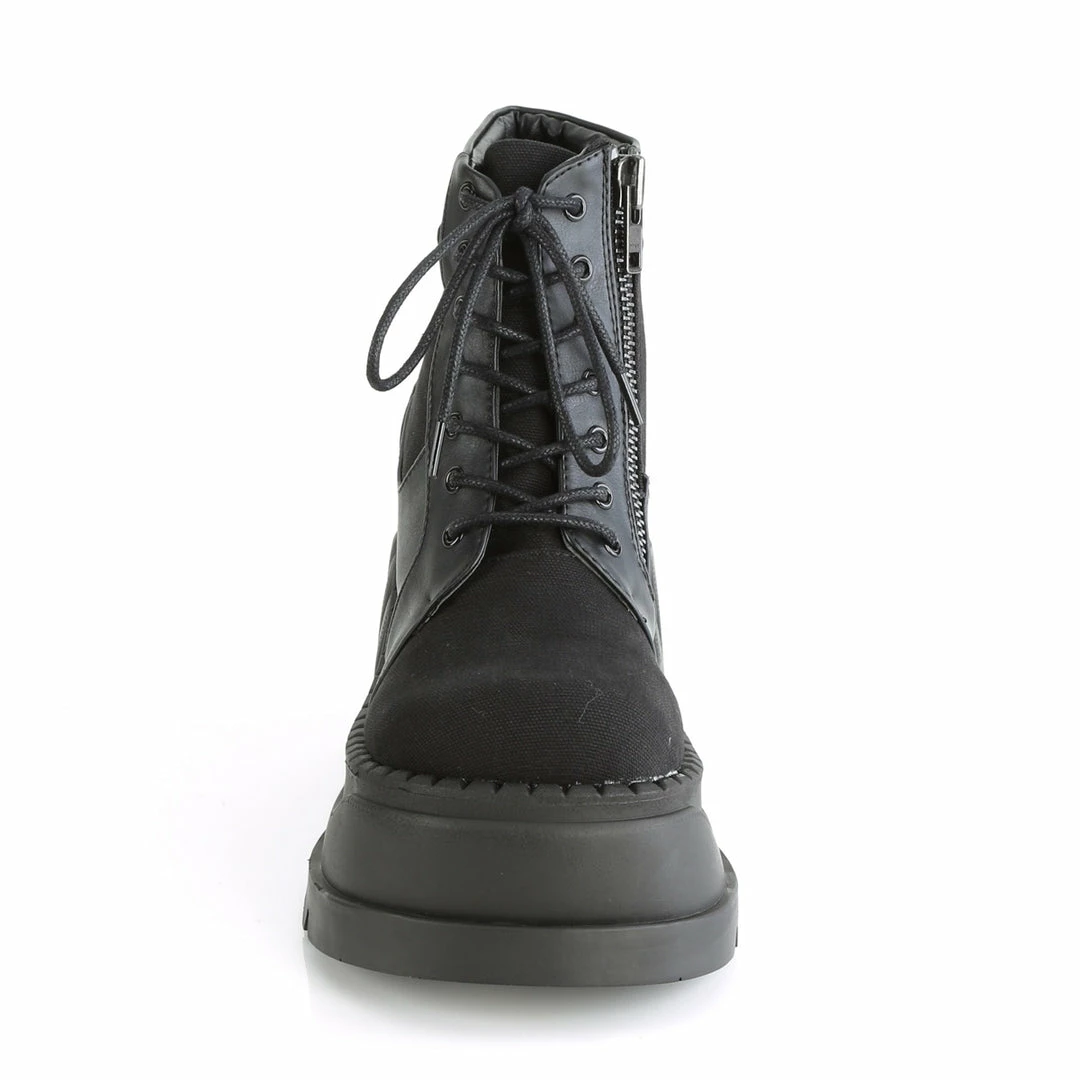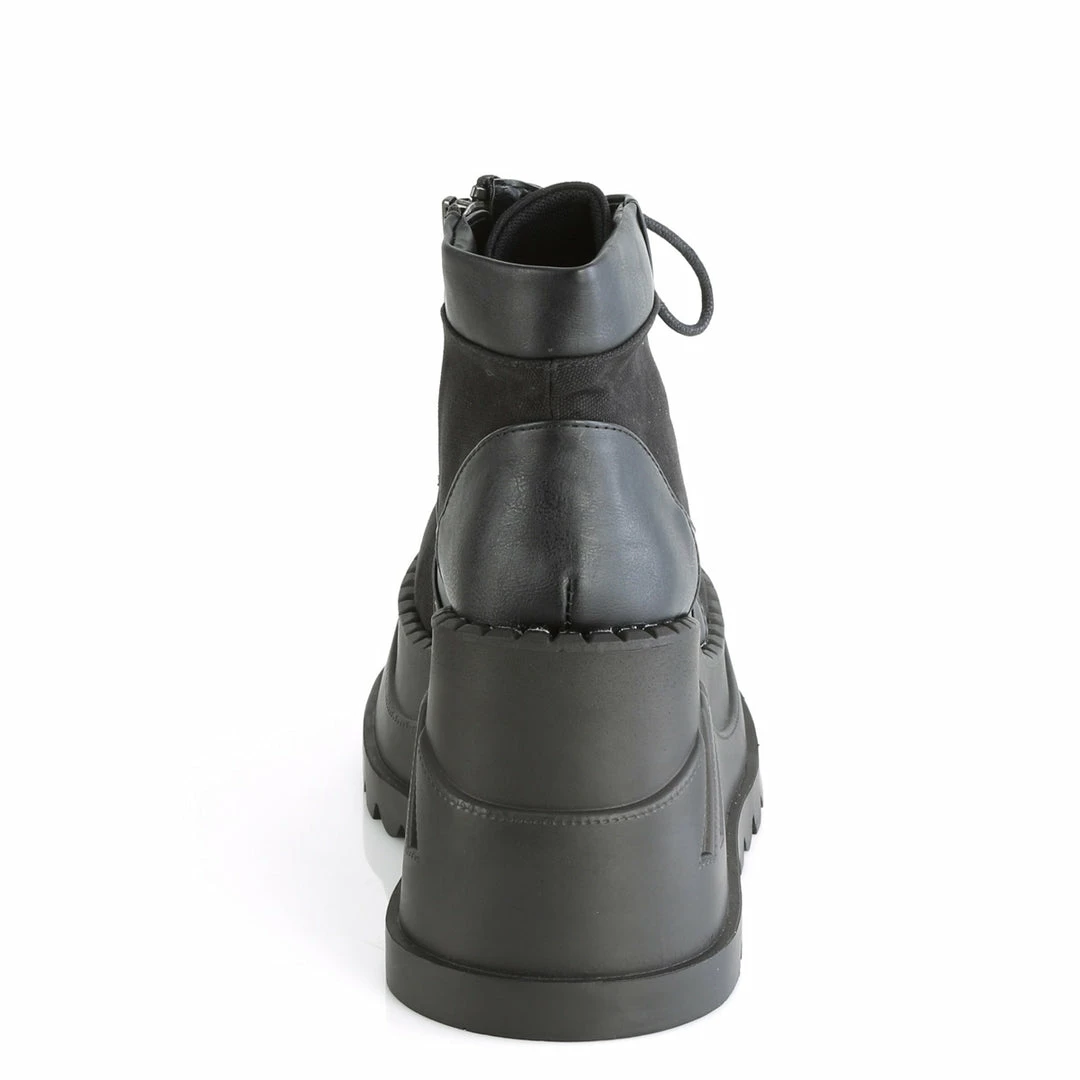 4 3/4″ (12.1cm) Wedge platform lace-up front bootie with padded ankle and inside zipper.
