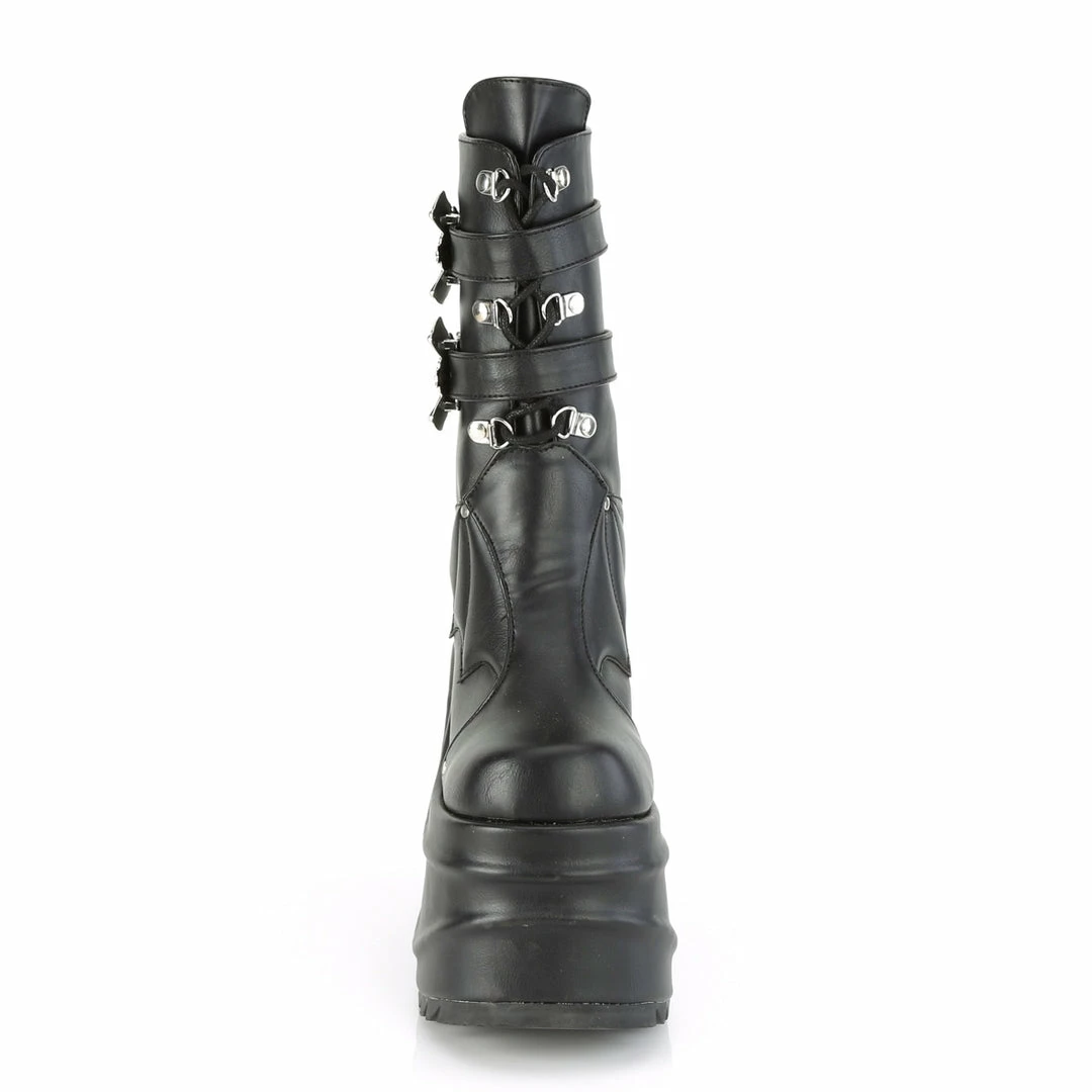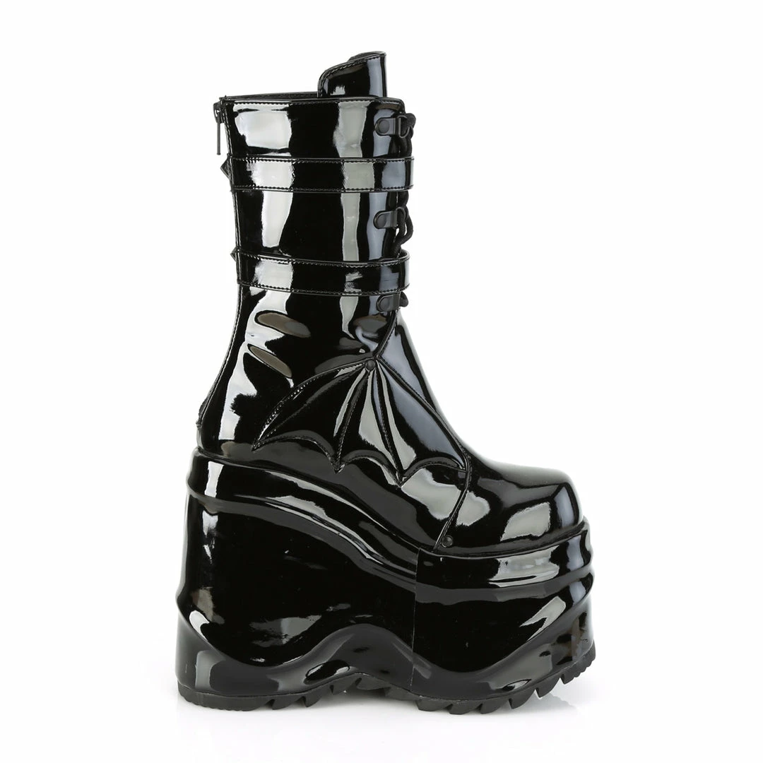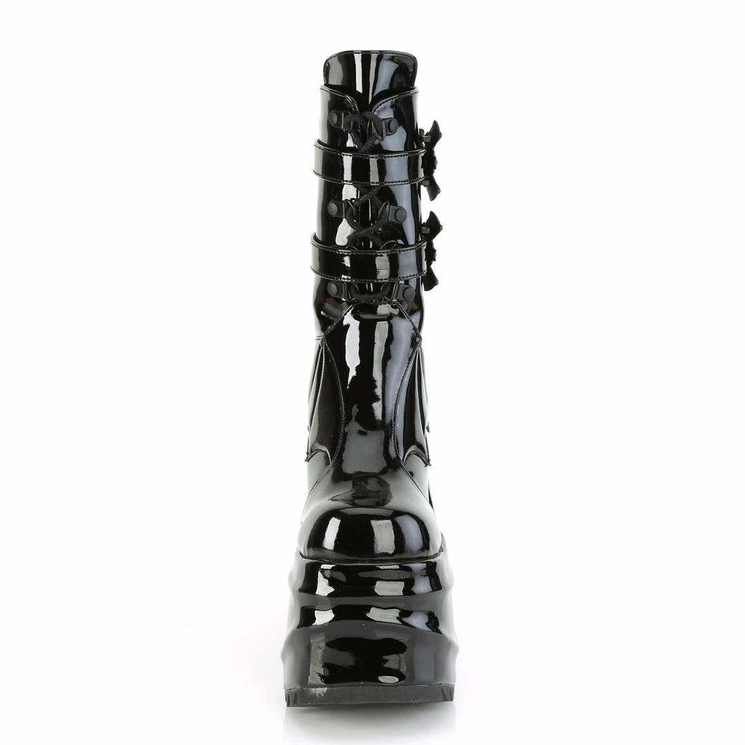 6″ (15.2cm) platform wedge lace-up mid-calf boot featuring quilted bat wings design on vamp and dual bat buckle ankle straps, back metal zip closure.