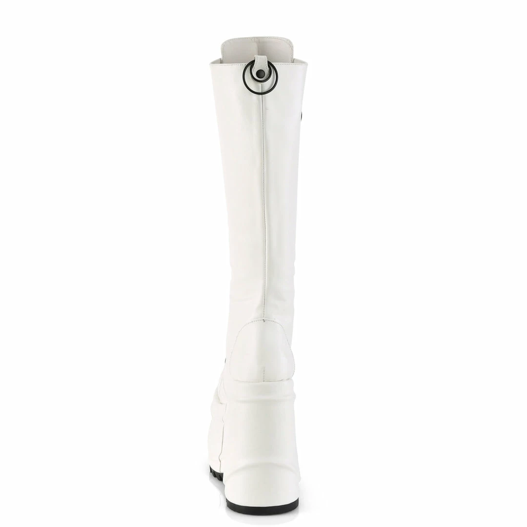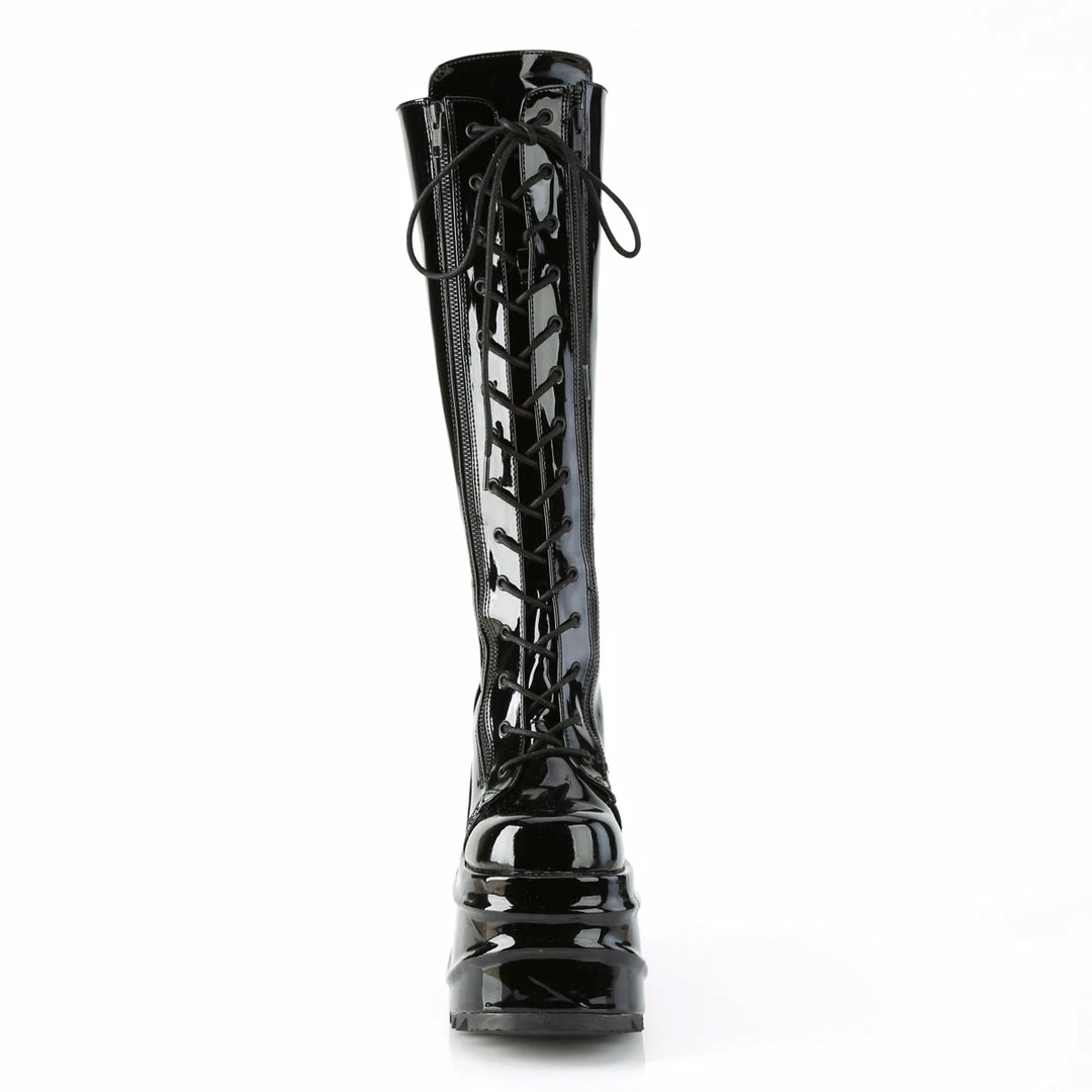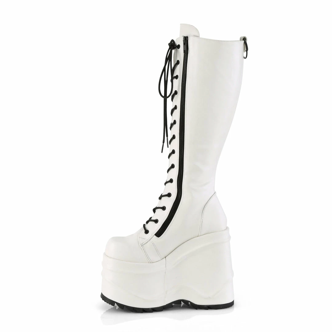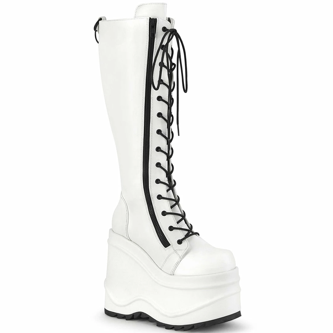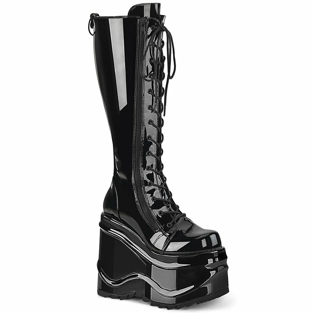 6″ (15.2cm) platform wedge lace-up knee high boot featuring full length double metal zipper in the front.