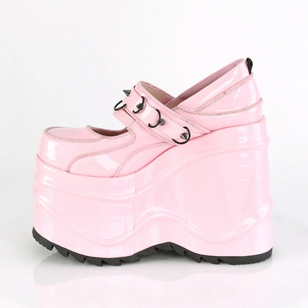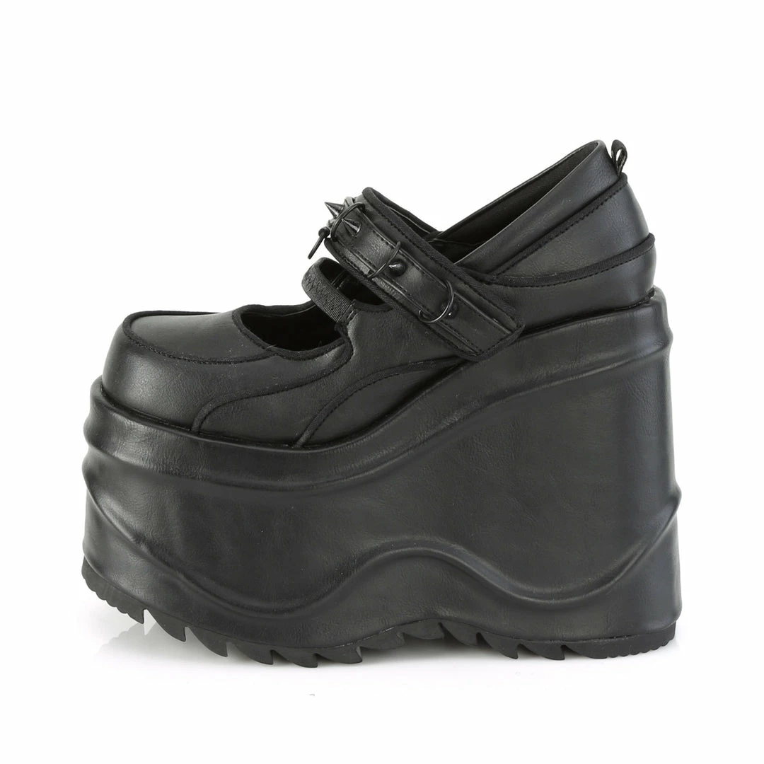 6″ (15.2cm) platform wedge Mary Jane featuring elastic instep strap and hook & loop strap with cone spike stud & d-ring details.