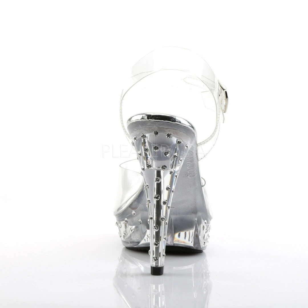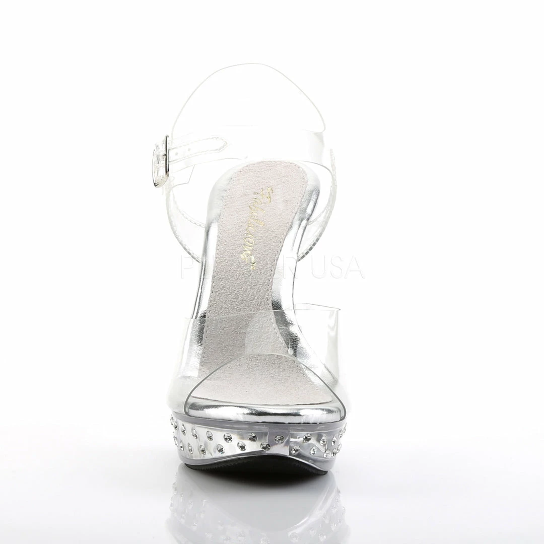 5″ (12.7cm) heel, 1″ (2.5cm) platform ankle strap sandal featuring rhinestone studded bottom.