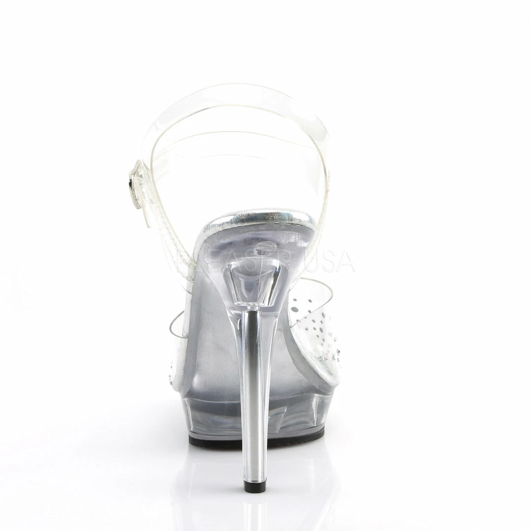 5″ (12.7cm) heel, 3/4″ (1.9cm) platform ankle strap sandal featuring multi sized rhinestones on vamp.