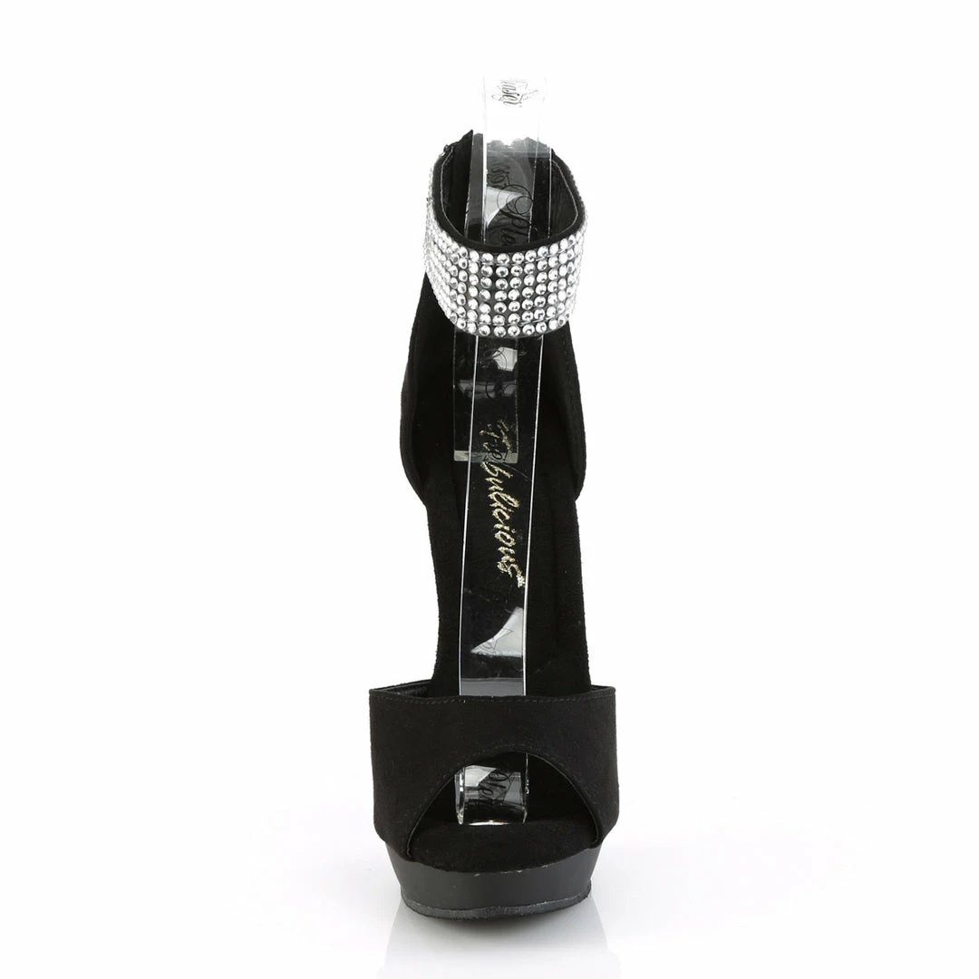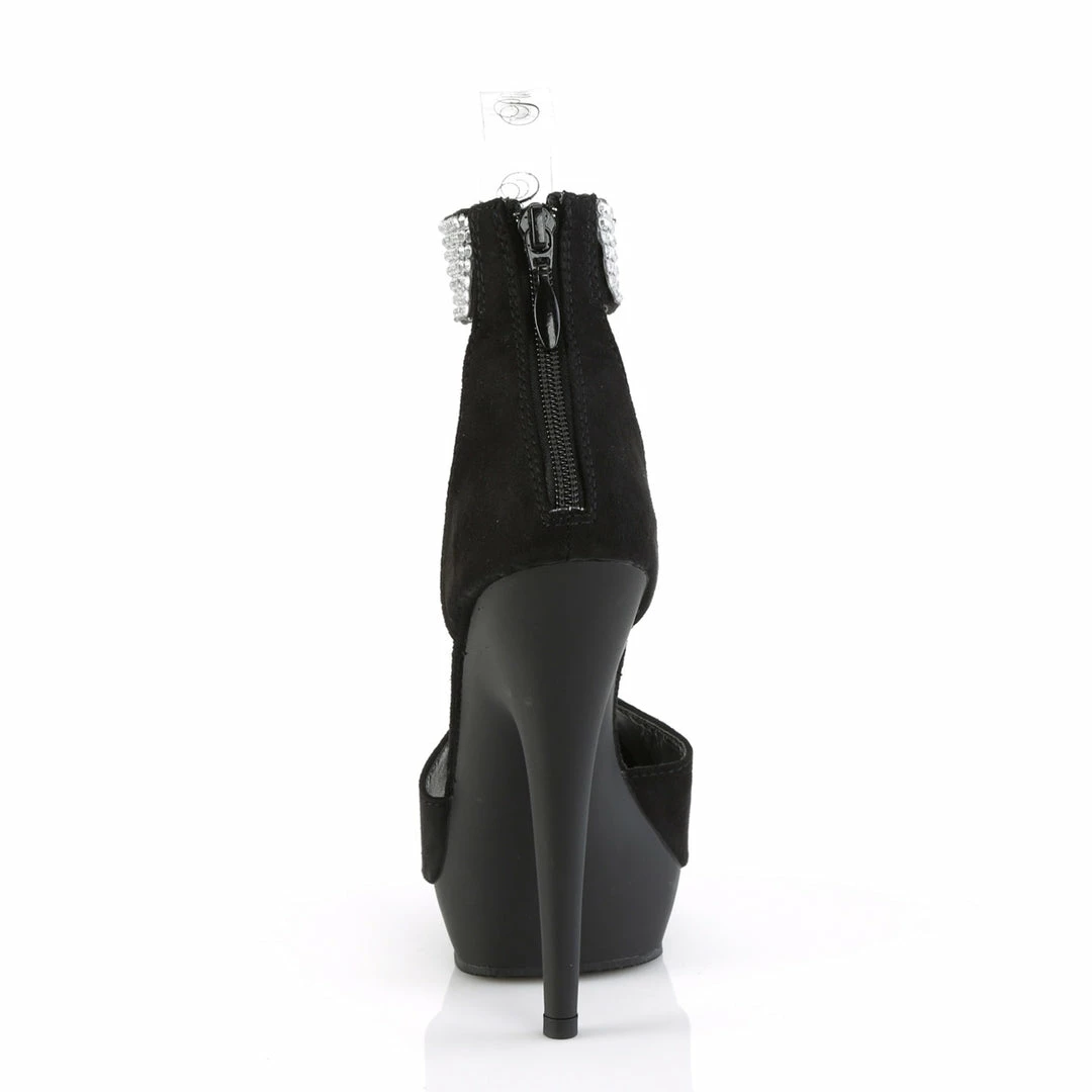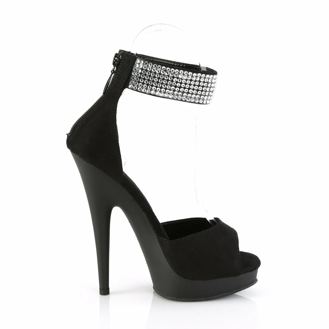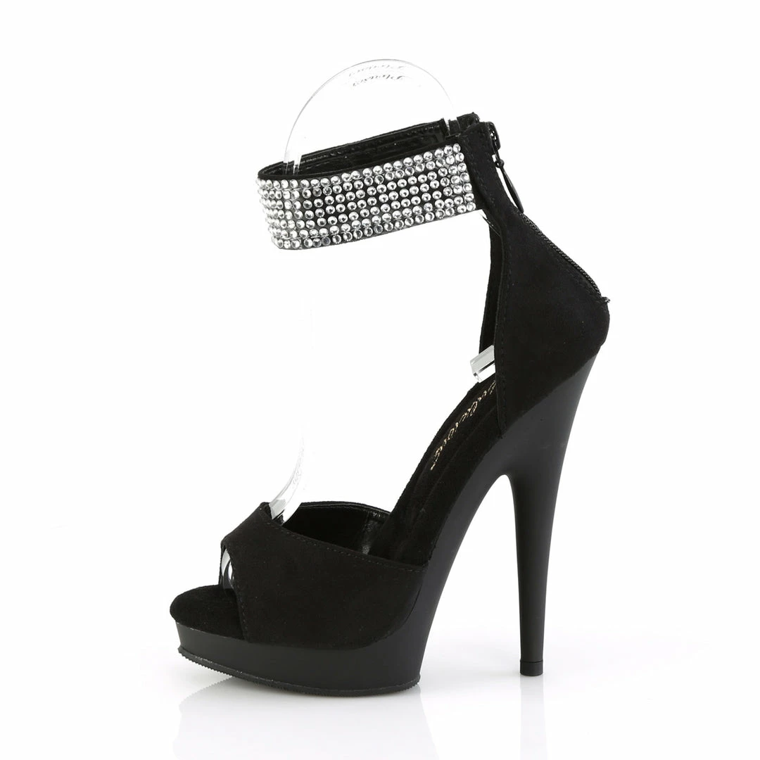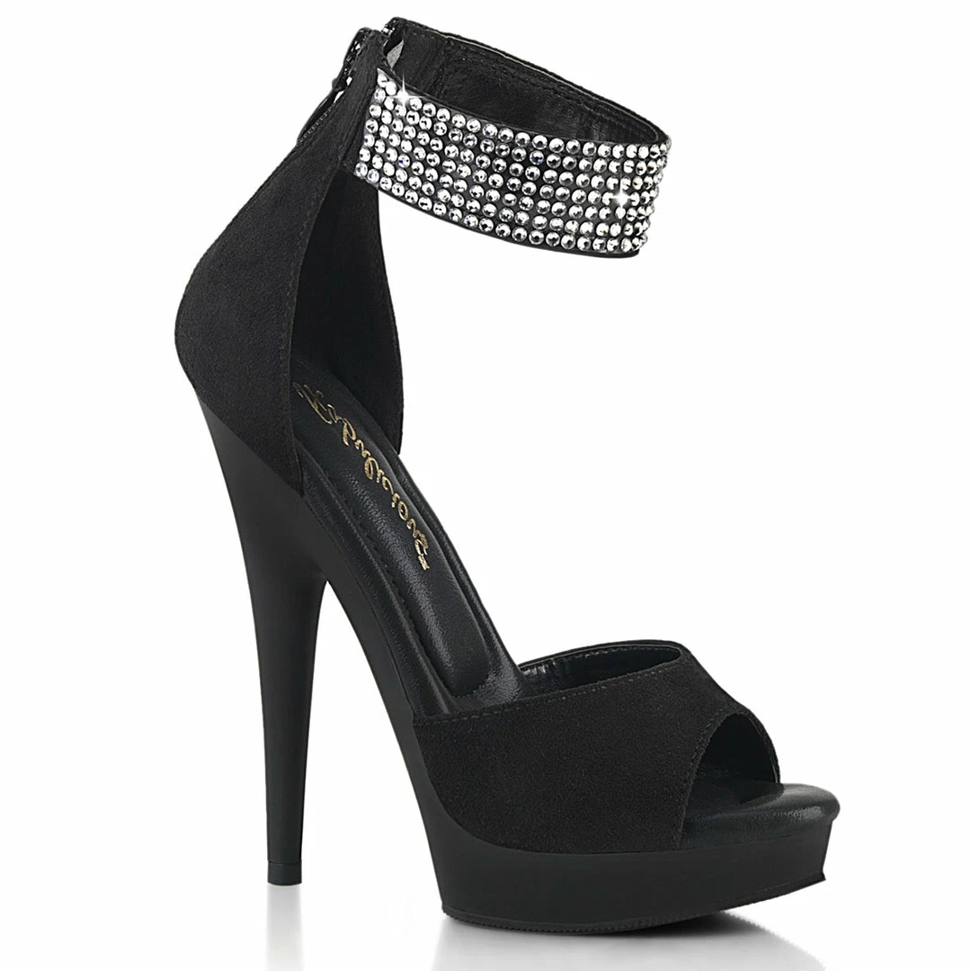 6″ (15.2cm) heel, 1″ (2.5cm) platform open toe d’Orsay sandal featuring rhinestone embellished ankle cuff and back zip closure. Includes a pair of matching color gel insoles for arch support and comfort.