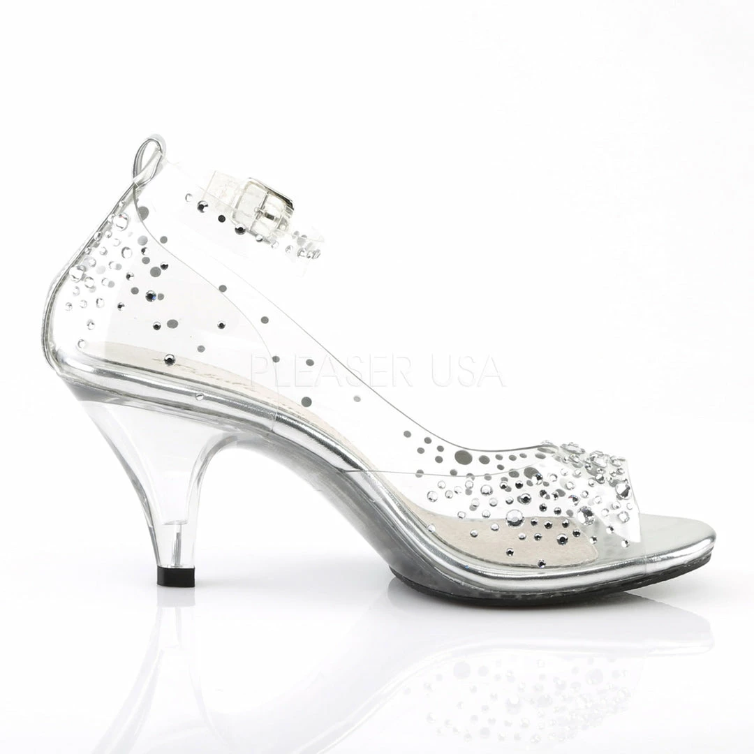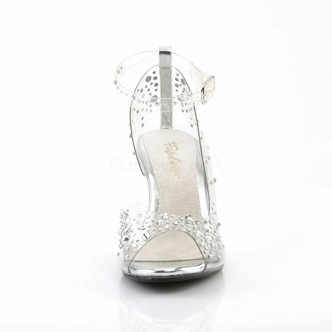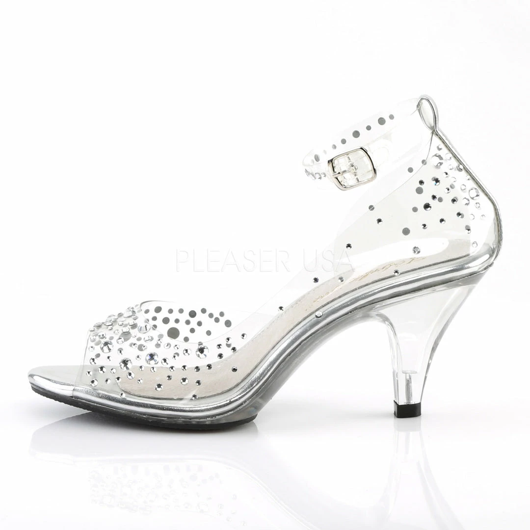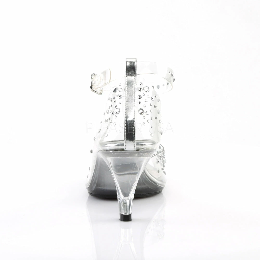 3″ (7.6cm) heel, 1/8″ (0.3cm) platform closed back open toe ankle strap sandal featuring instep cutout and rhinestone embellishment on vamp.