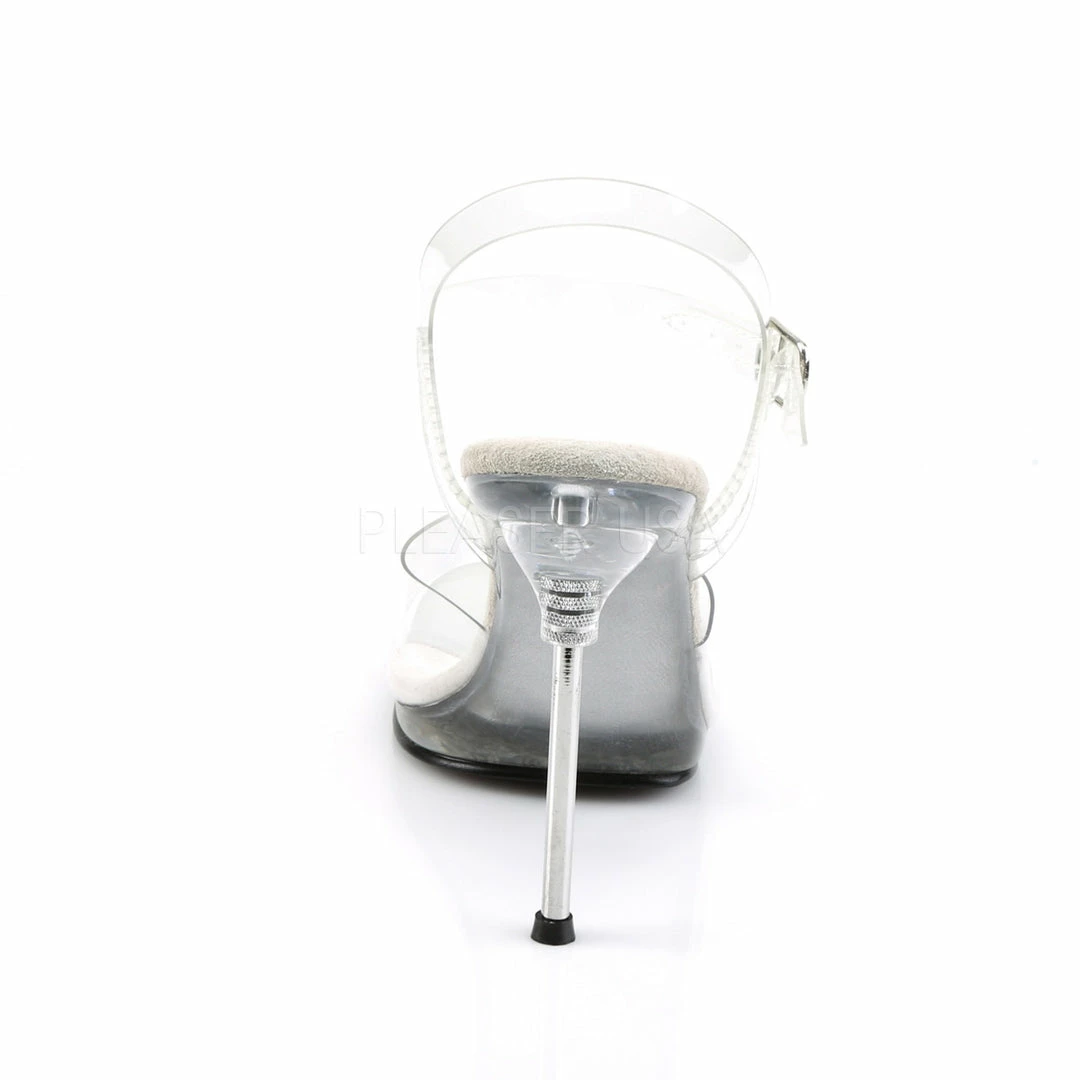 4 1/2″ (11.4cm)Β heel, 1/4″ (0.6cm) platform ankle strap sandal.