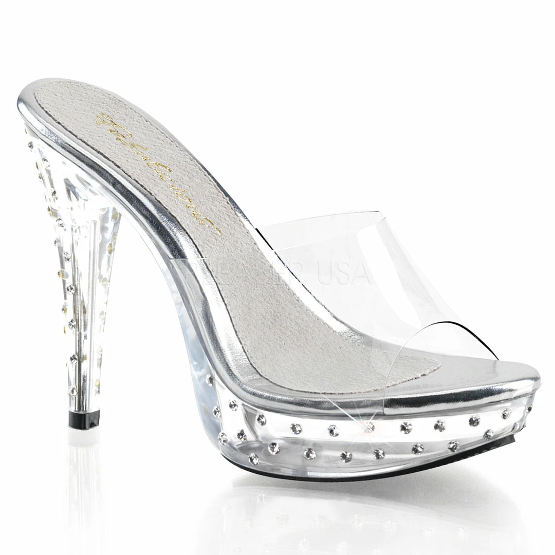 5″ (12.7cm) heel, 1″ (2.5cm) platform slide featuring rhinestone studded bottom.