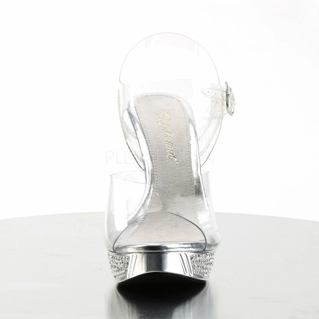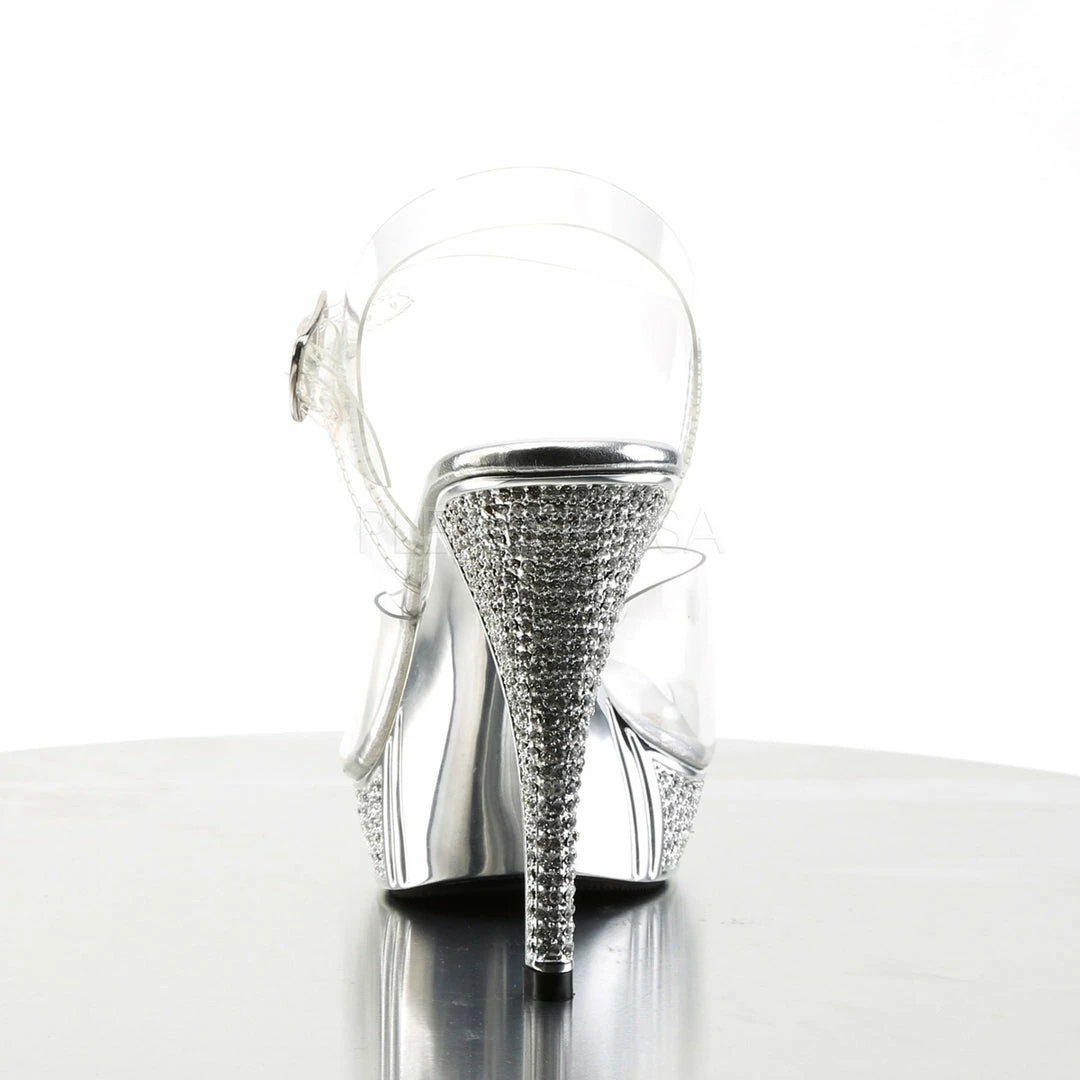 4 1/2″ (11.4cm) heel, 1″ (2.5cm) chrome plated platform ankle strap sandal featuring rhinestone embellished heel and platform.