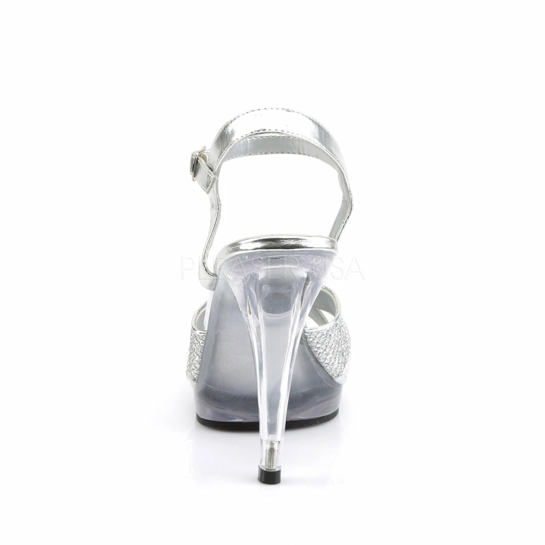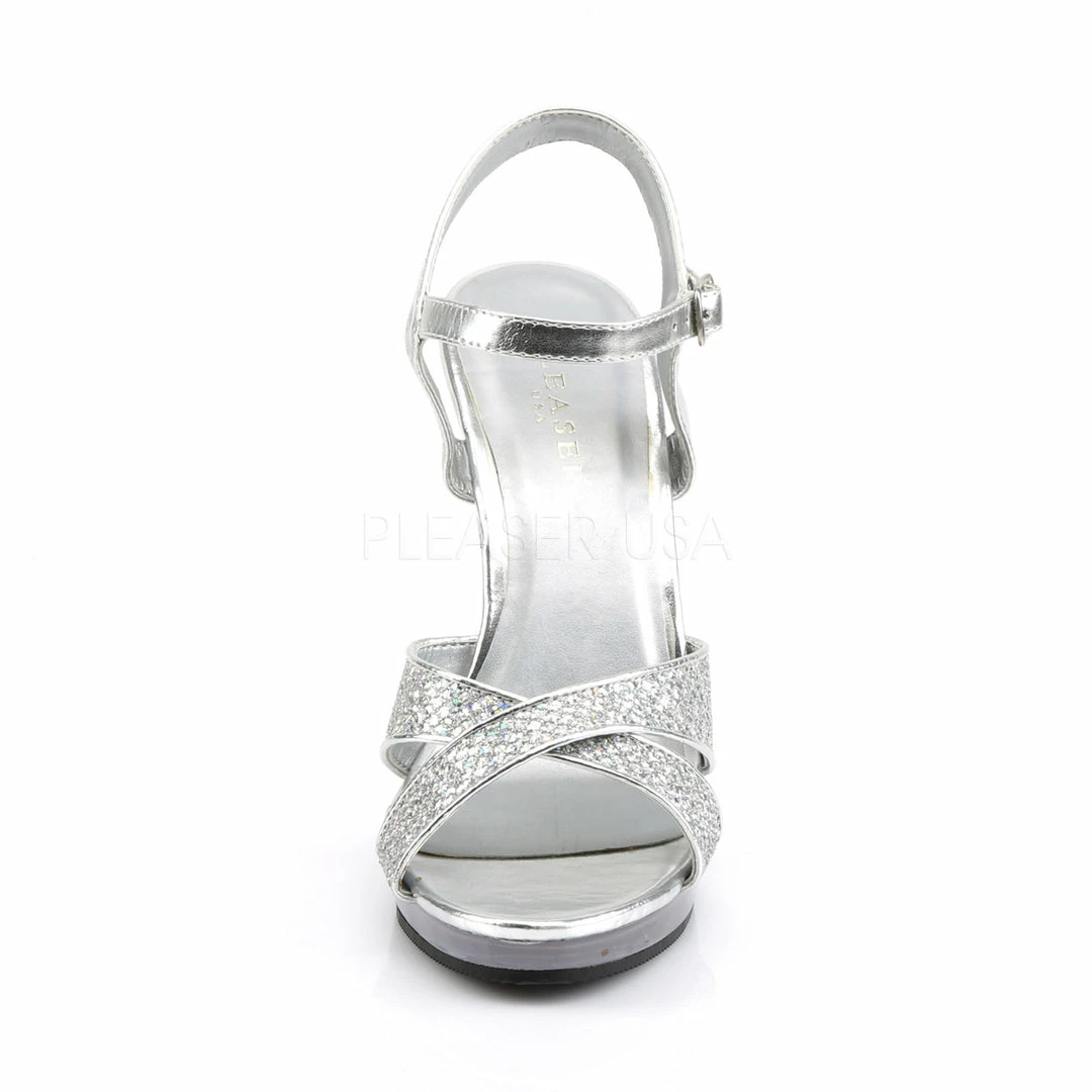 4 1/2″ (11.4cm) heel, 1/2″ (1.3cm) platform criss-cross ankle strap sandal.