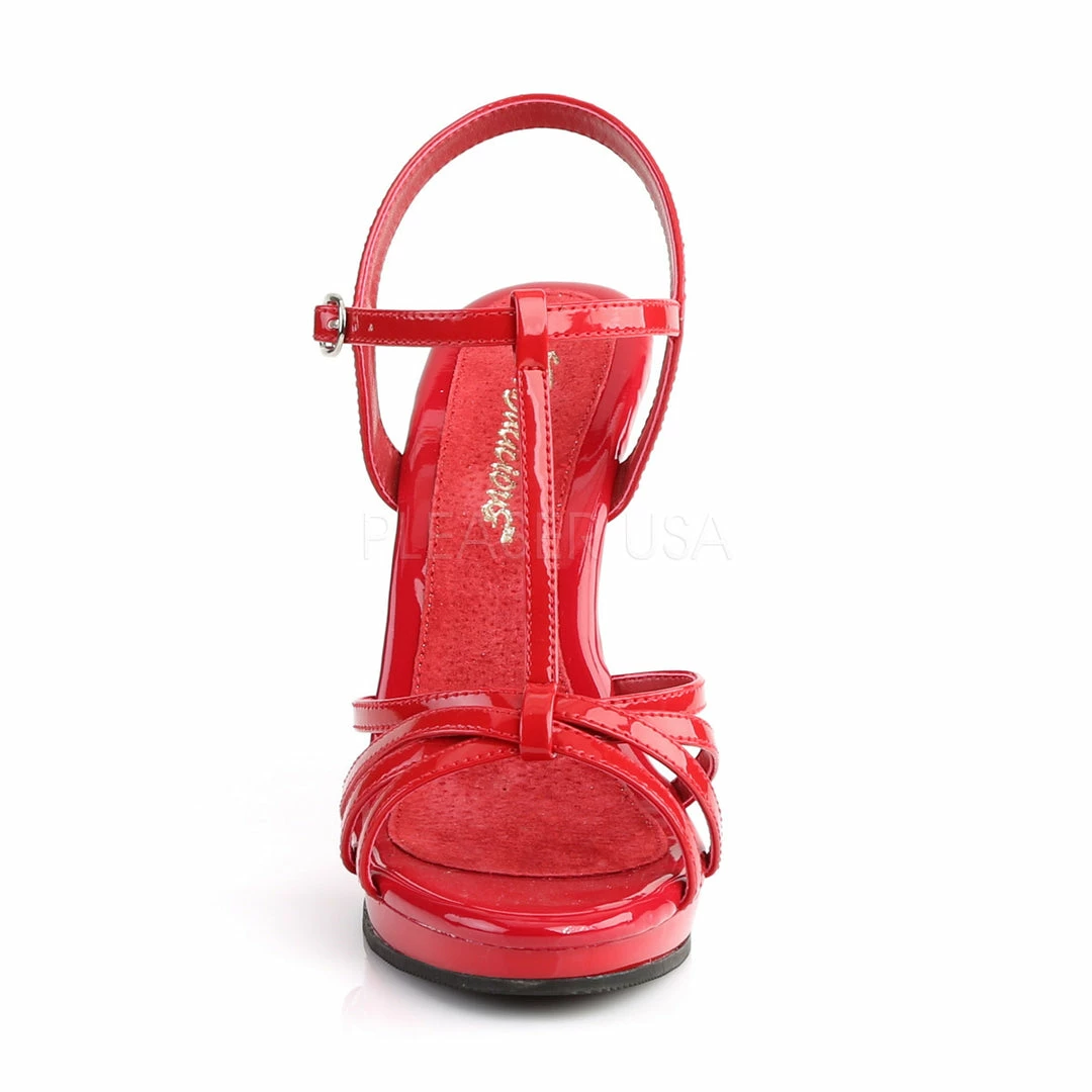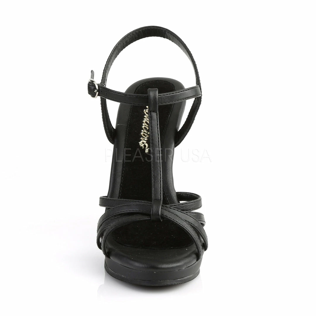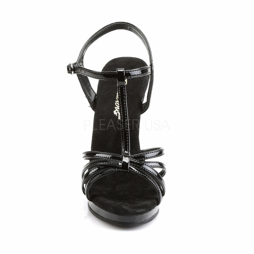 4 1/2″ (11.4cm) heel, 1/2″ (1.3cm) platform t-strap strappy sandal.