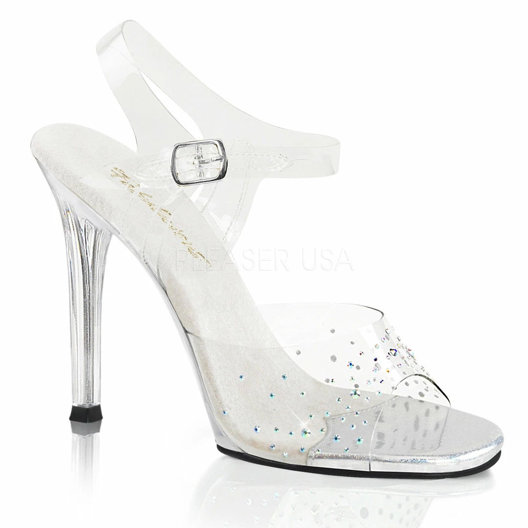 4 1/2″ (11.4cm) heel ankle strap sandal featuring multi sized AB rhinestones on vamp.