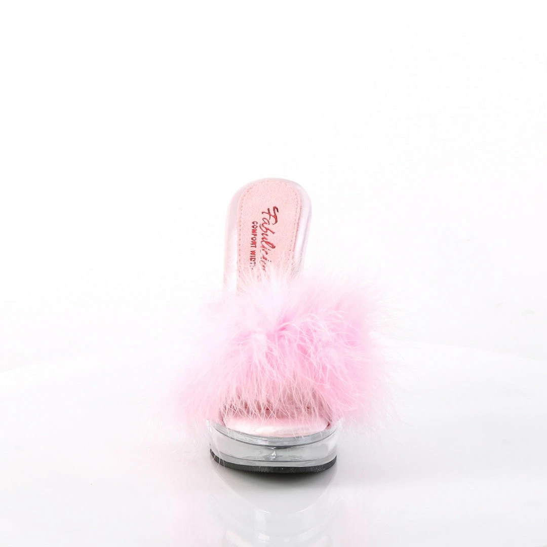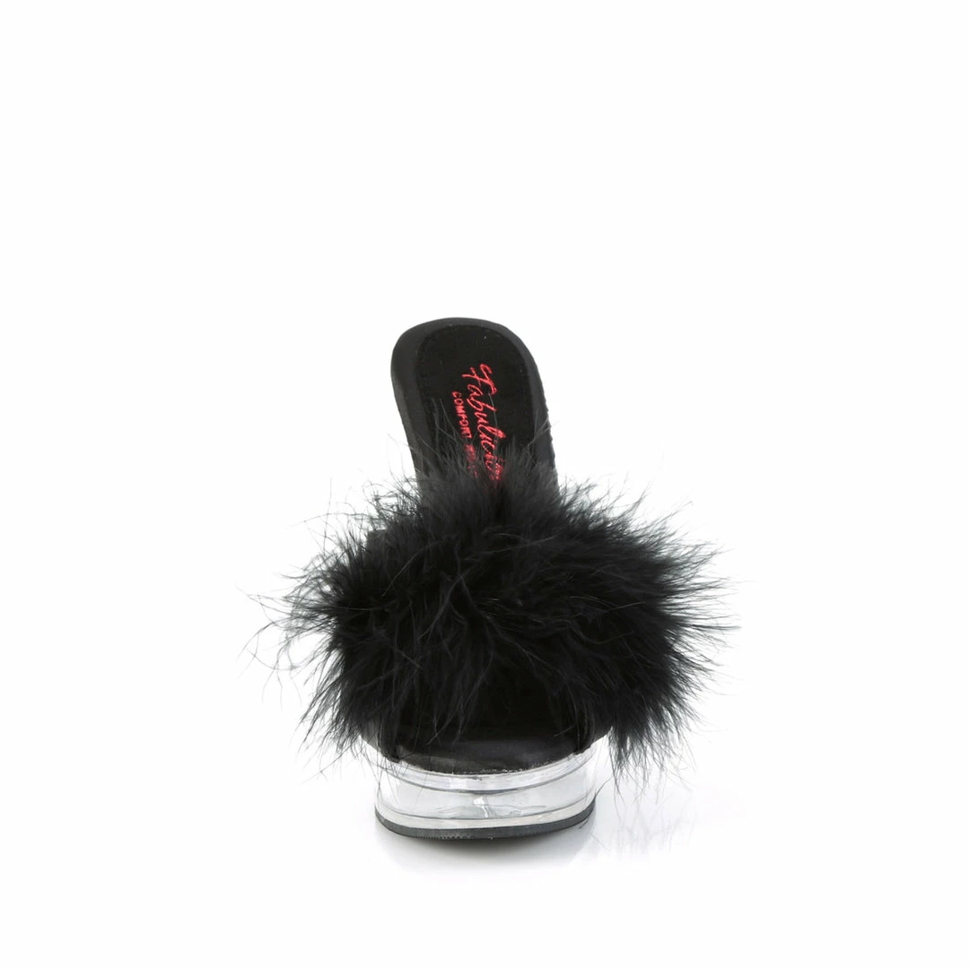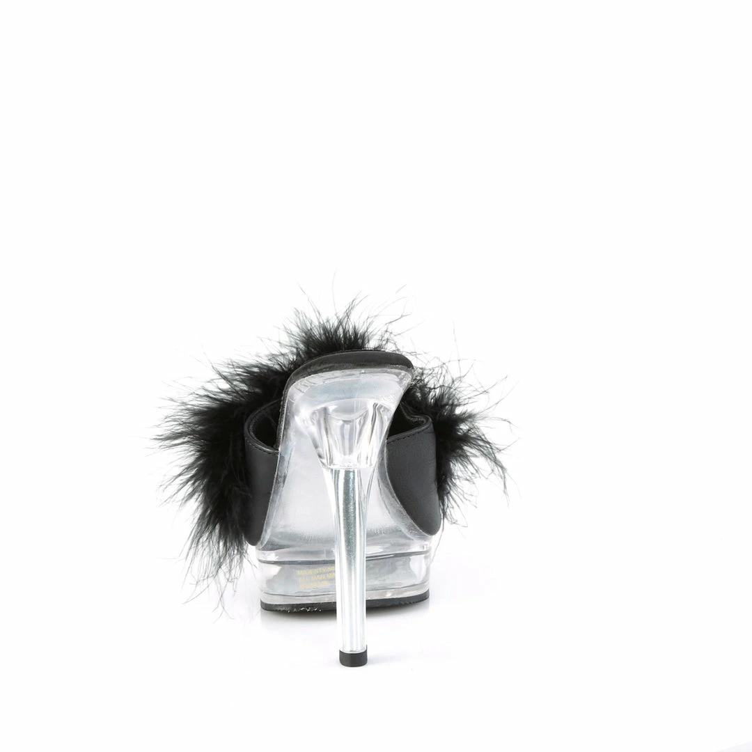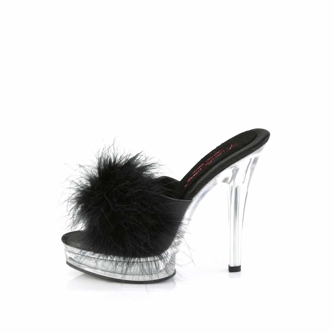 5″ (13.2cm) heel, 7/8″ (2.5cm) platform comfort width marabou slipper.