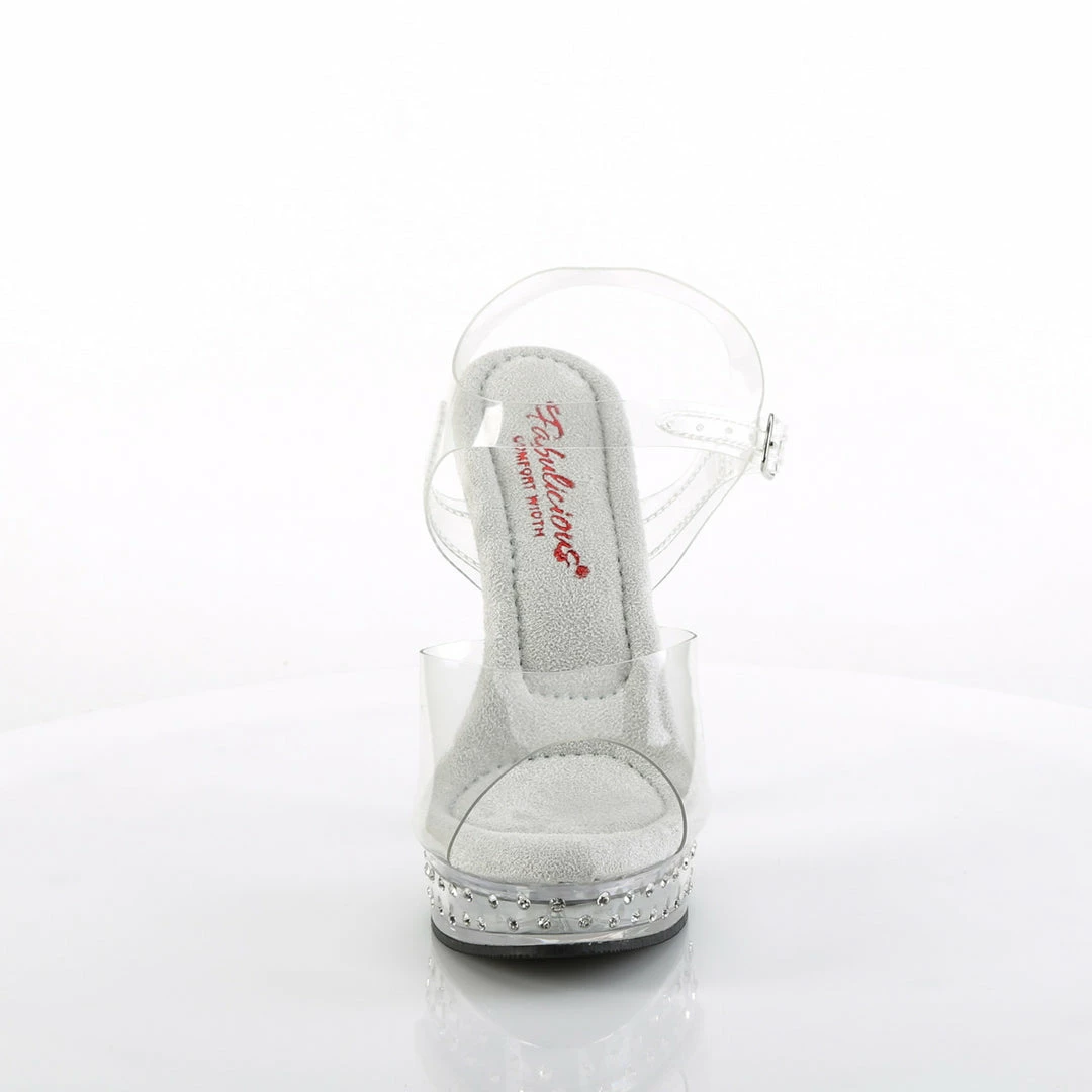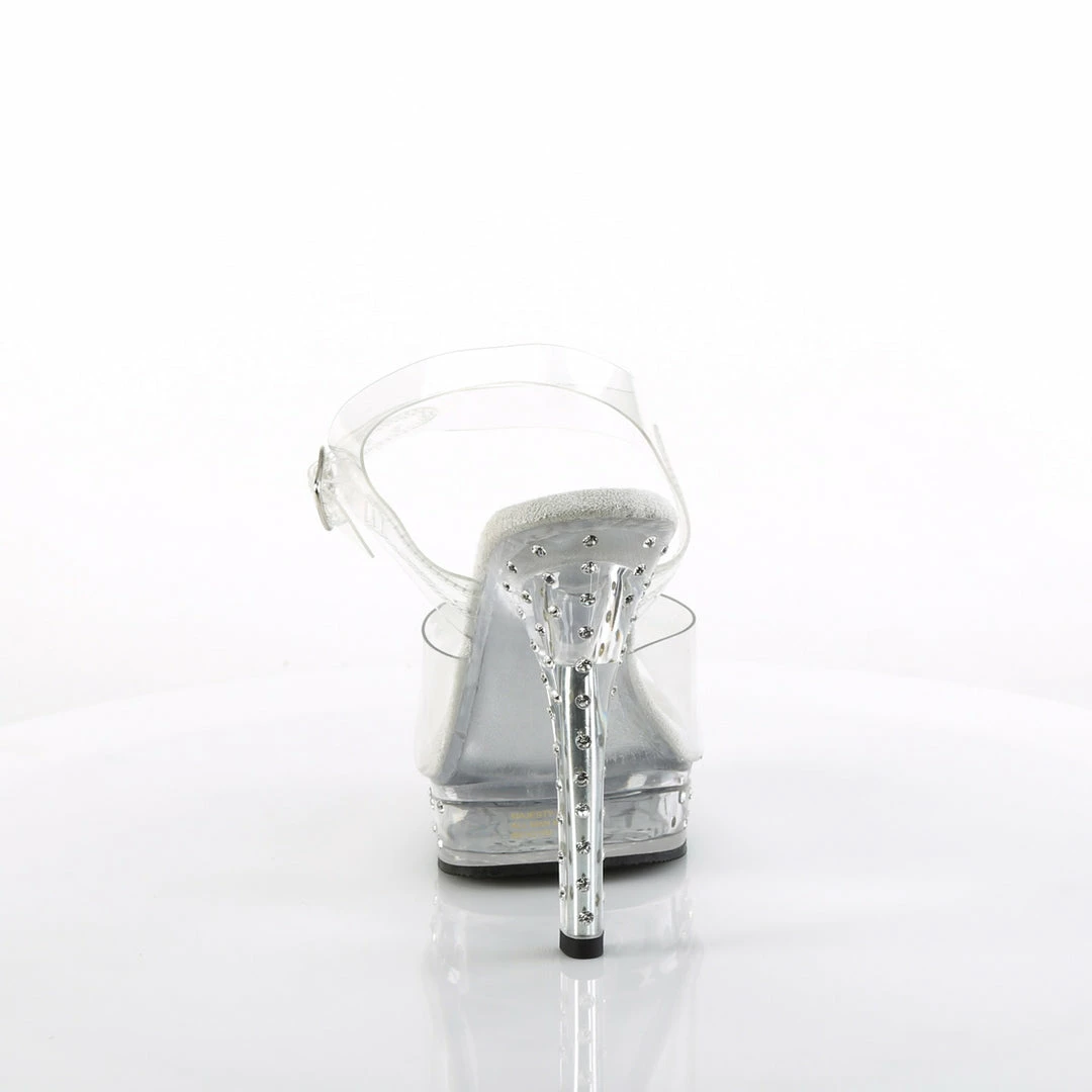 5″ (13.2cm) heel, 7/8″ (2.5cm) platform comfort width ankle strap sandal featuring rhinestones studded on the heel and platform bottom.