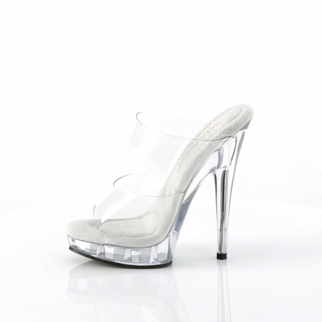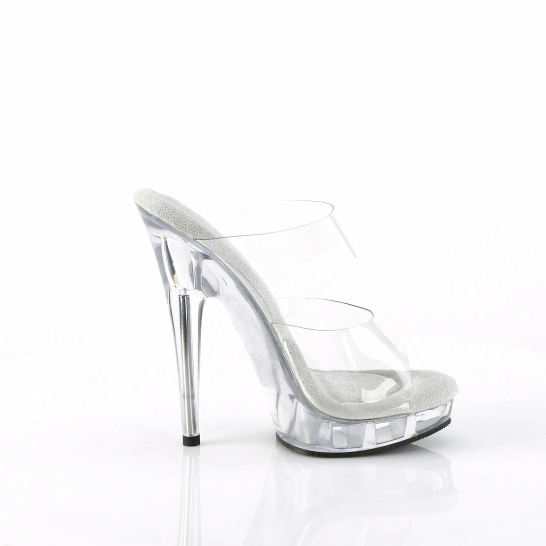6″ (15.2cm) heel, 1″ (2.5cm) platform two band slide. Includes a pair of matching color gel insoles for arch support and comfort.