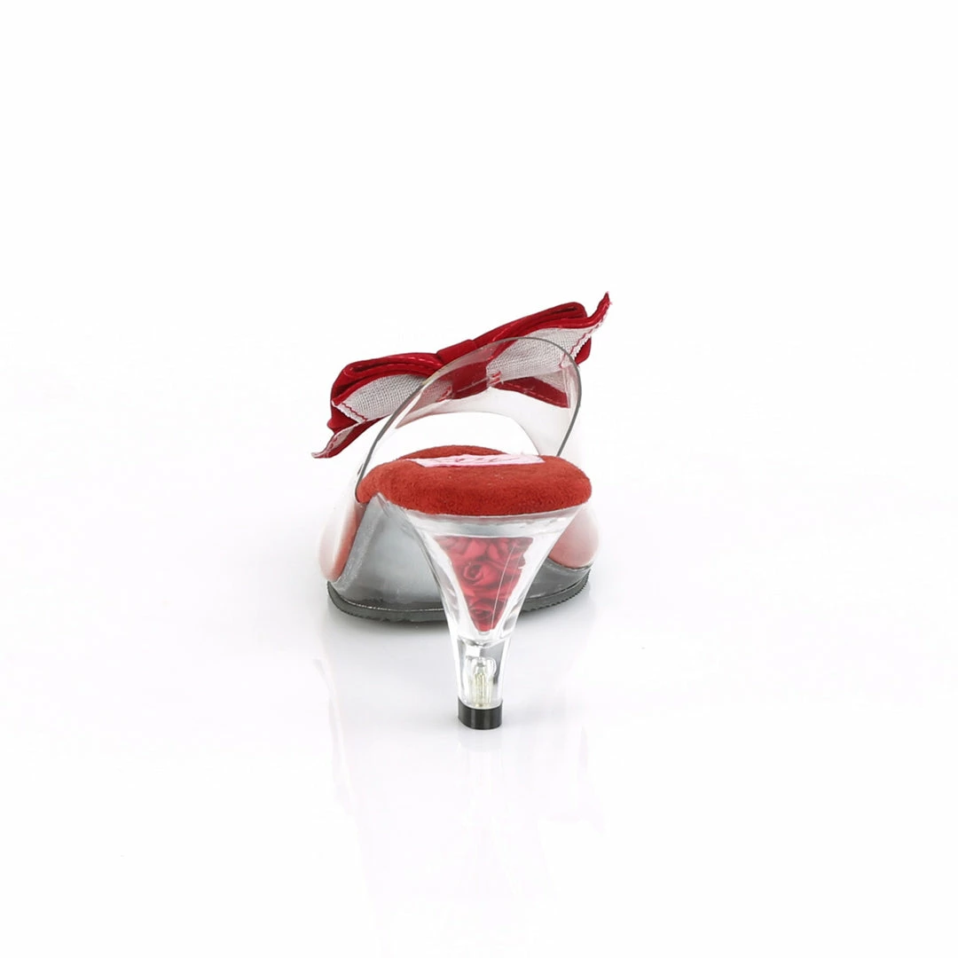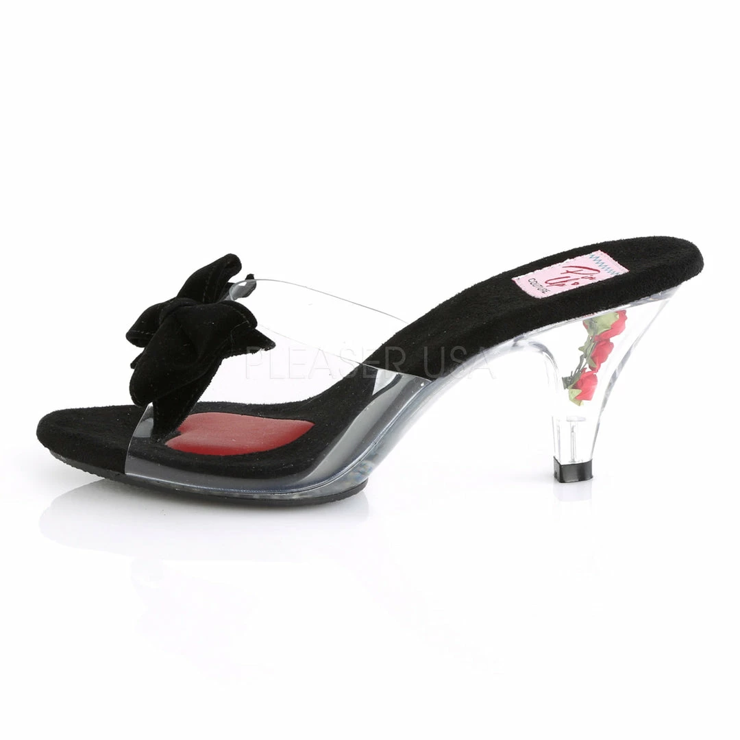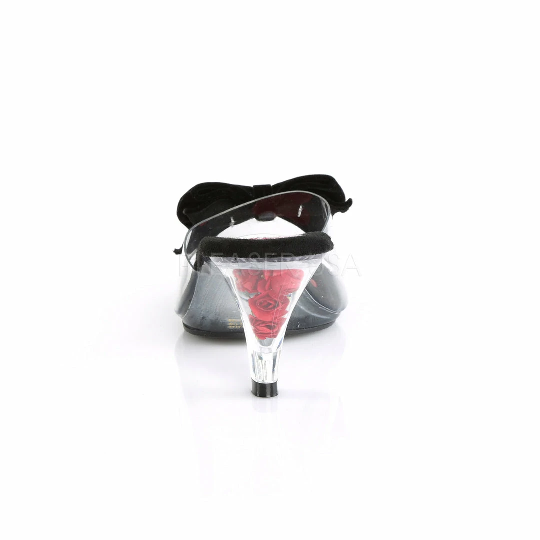 3″ (7.6cm) heel, 1/8″ (0.3cm) platform slide featuring velvet bow and flower filled heel.
