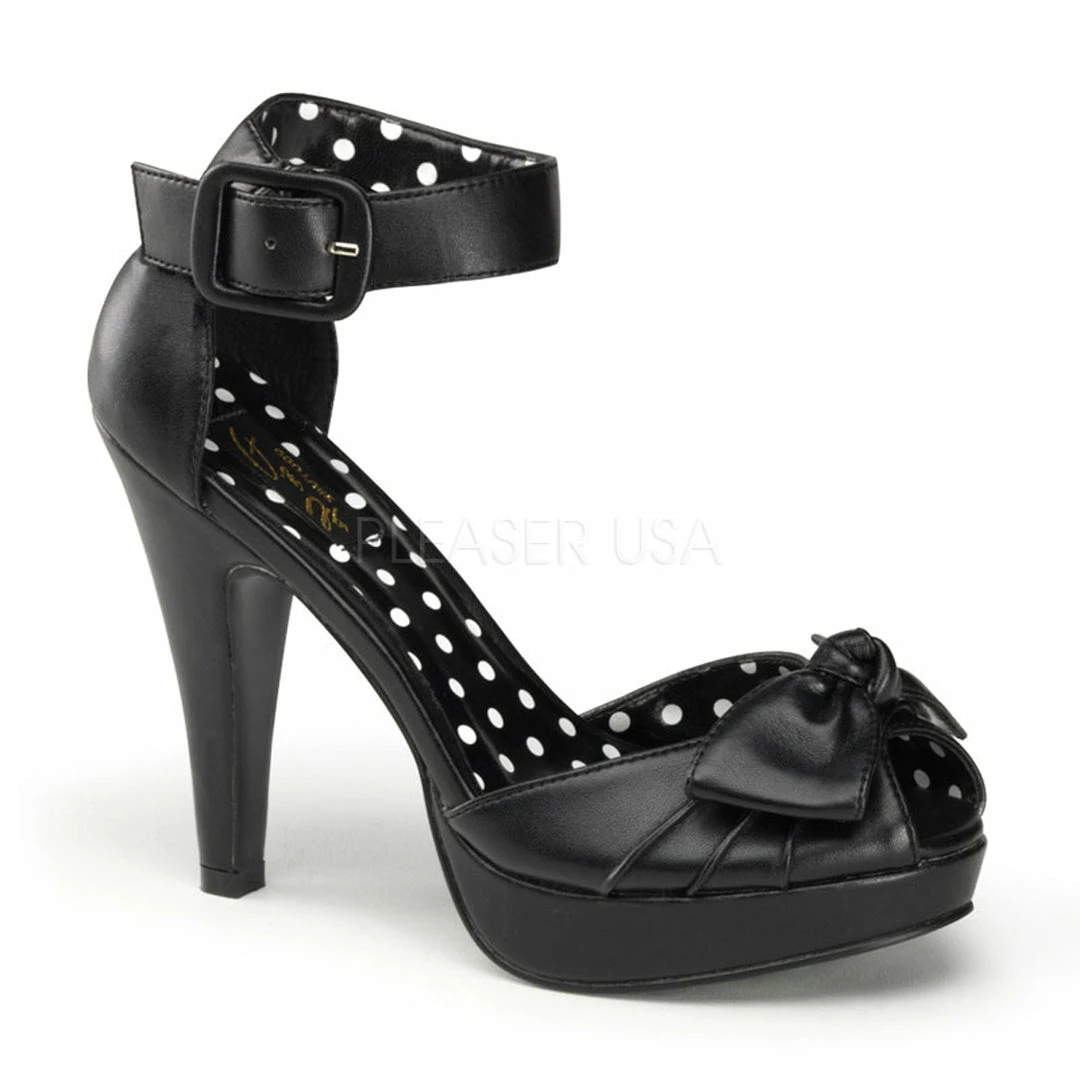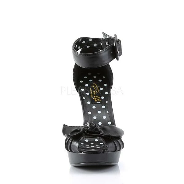 4 1/2″ (11.4cm) Heel, 1″ (2.5cm) hidden platform open toe ankle strap sandal with bow.