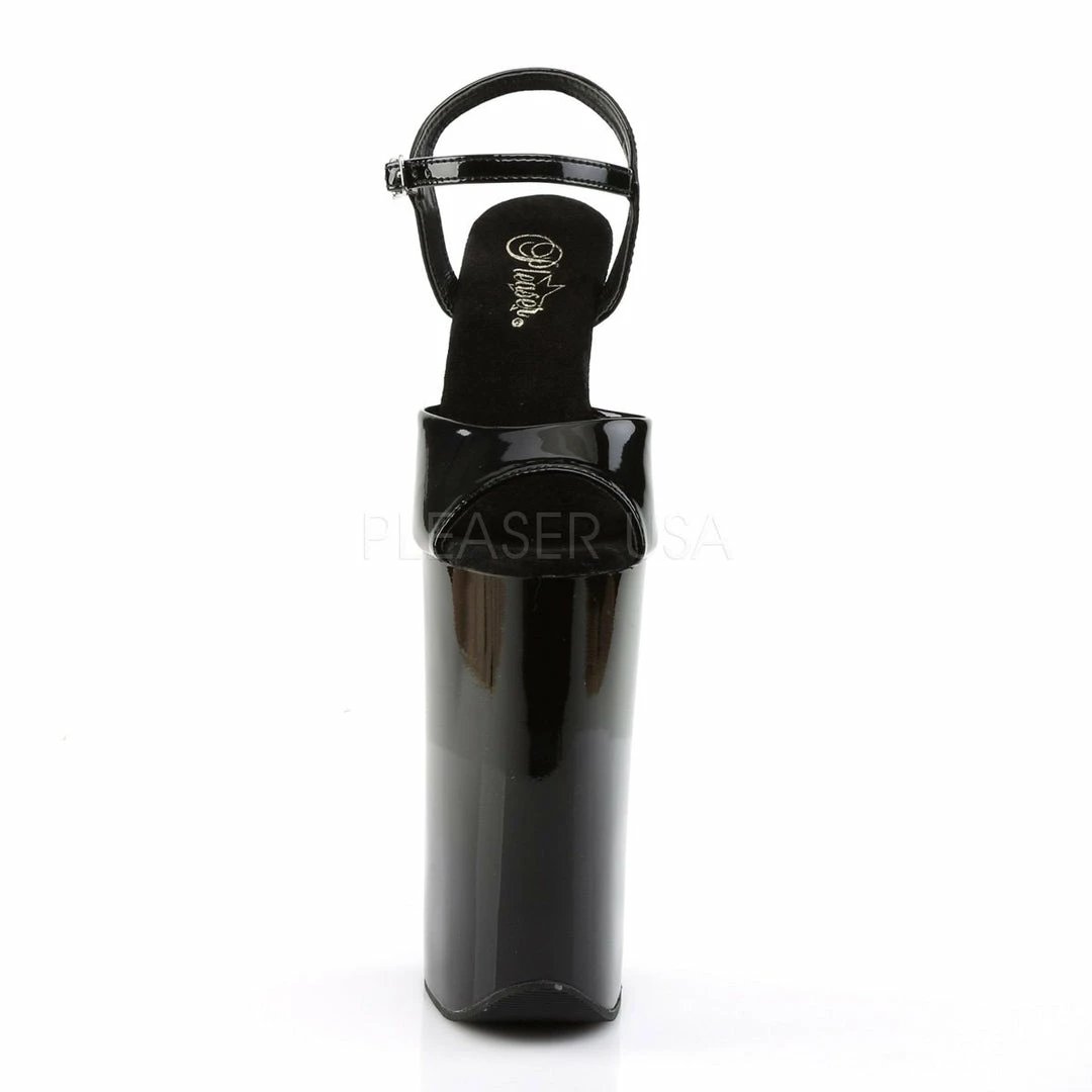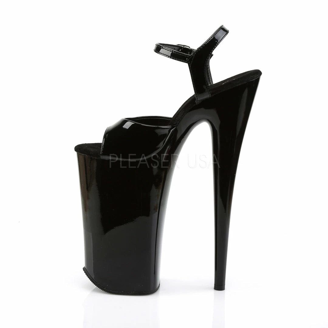 10″ (25.4cm) heel, 6 1/2″ (15.9cm) platform ankle strap sandal.