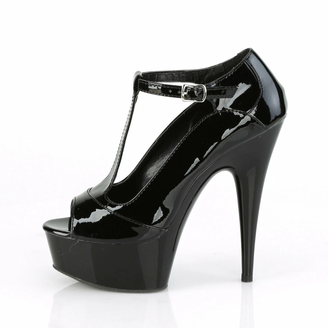 6″ (15.2cm) heel, 1/3/4″ (4.5cm) platform peep toe T-strap sandal.