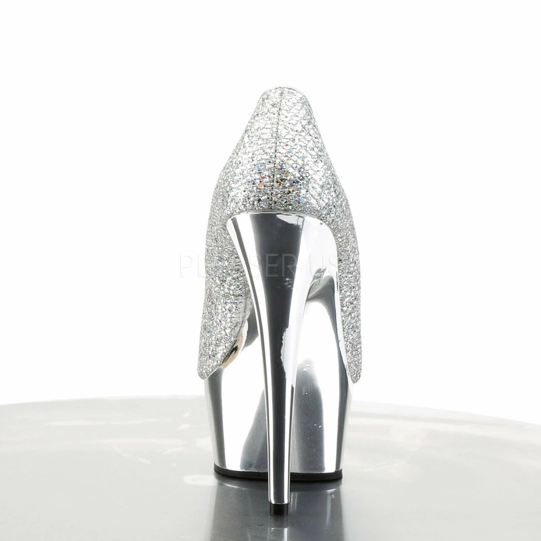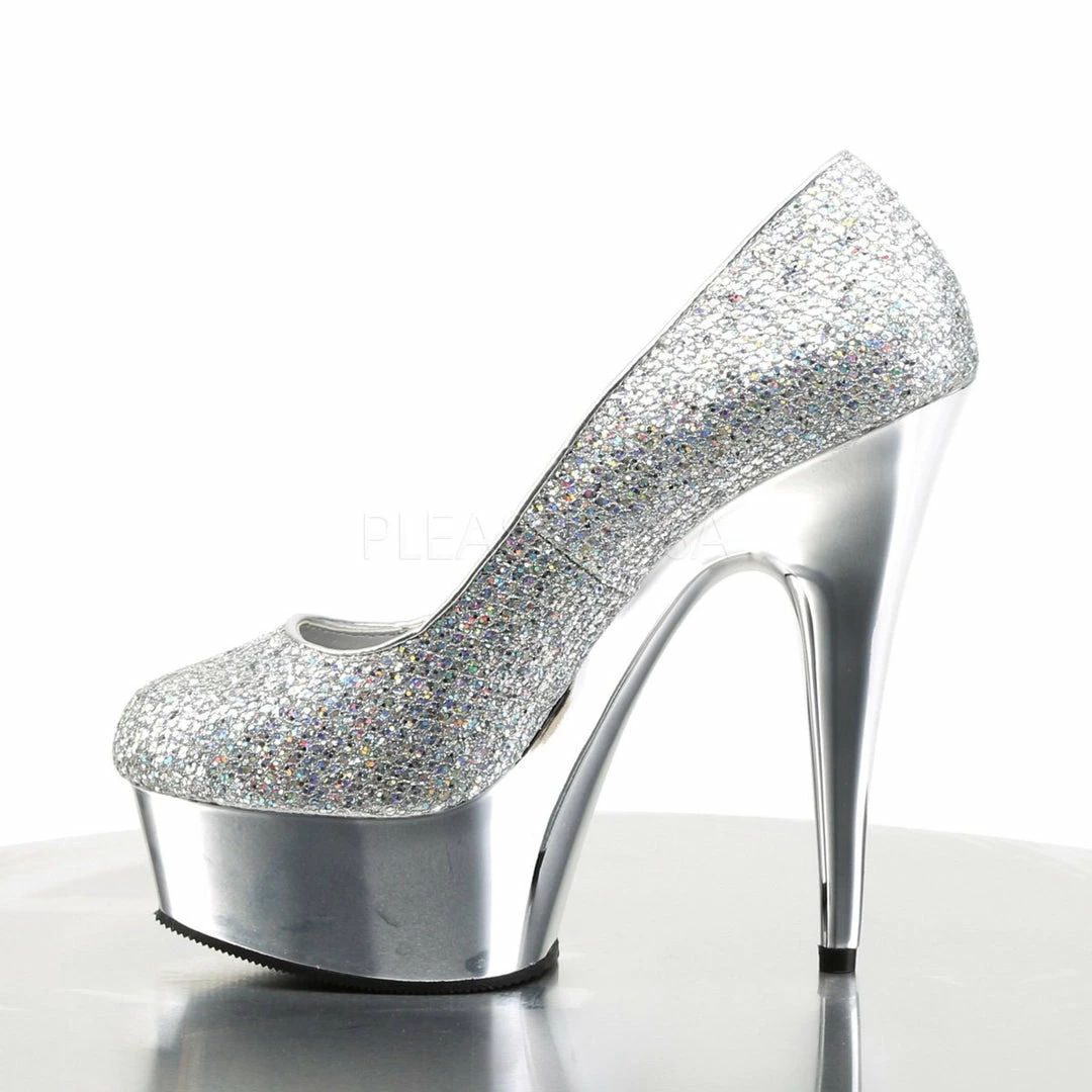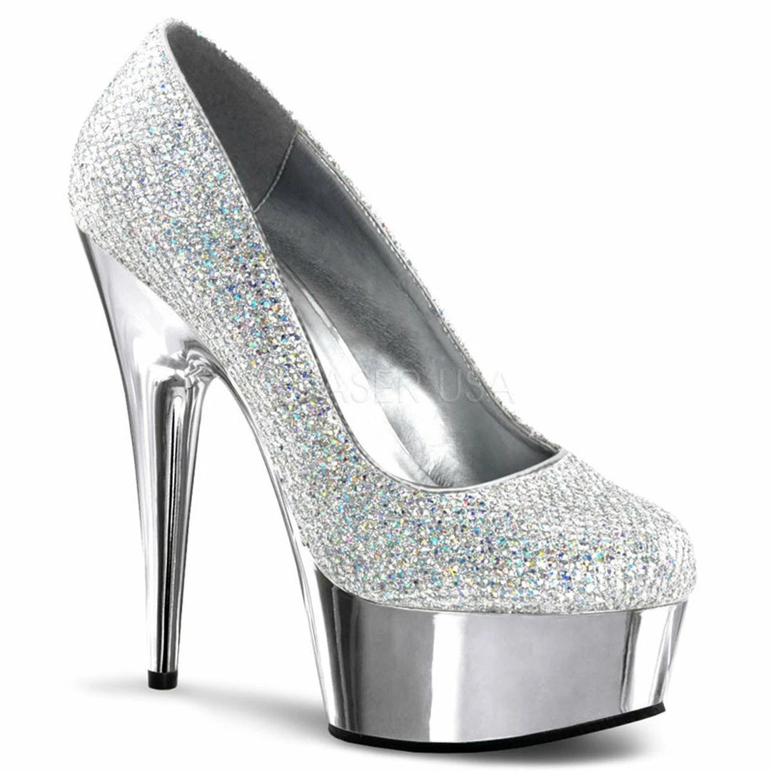 6″ (15.2cm) heel, 1/3/4″ (4.5cm) platform pump featuring glittered upper.