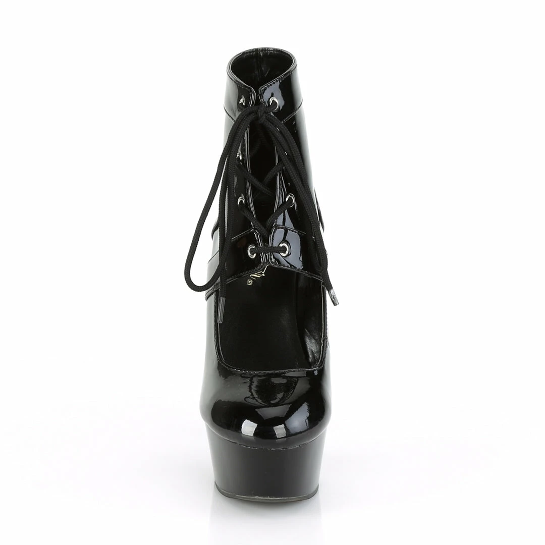 6″ (15.2cm) heel, 1/3/4″ (4.5cm) platform lace up front ankle bootie pump.