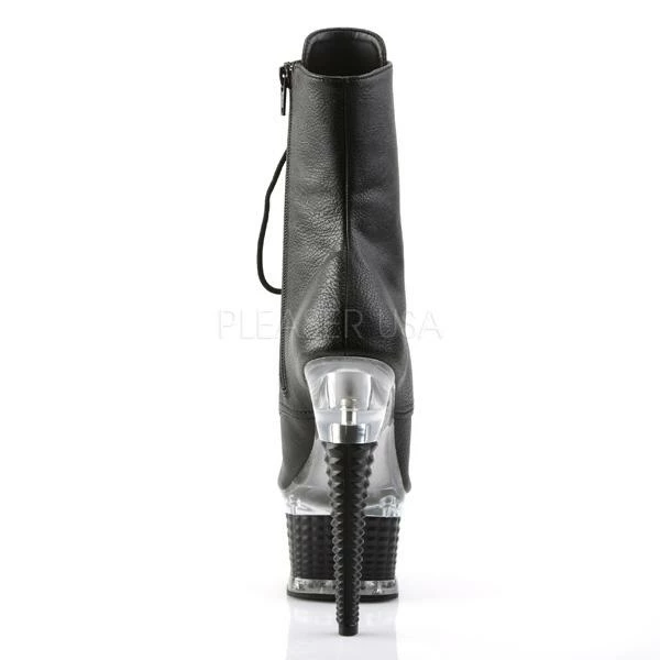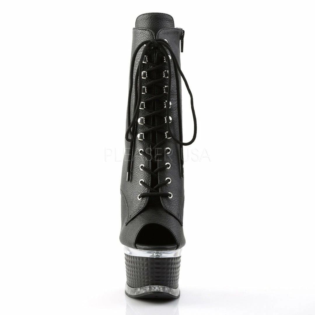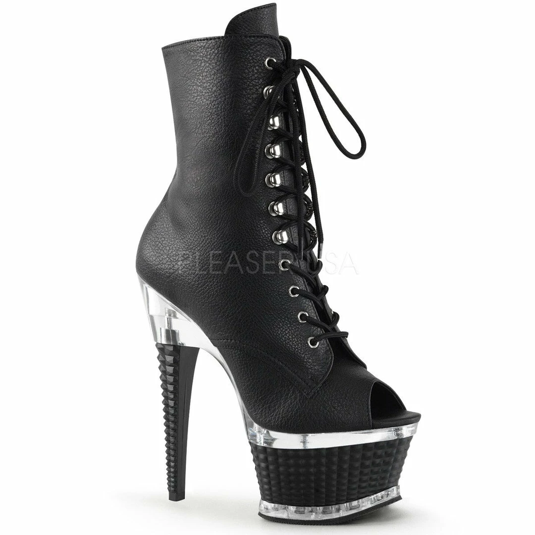 6 1/2″ (16.5cm) heel, 2 1/2″ (6.4cm) Textured platform peep toe, front lace-up ankle boot. Inside zip closure.