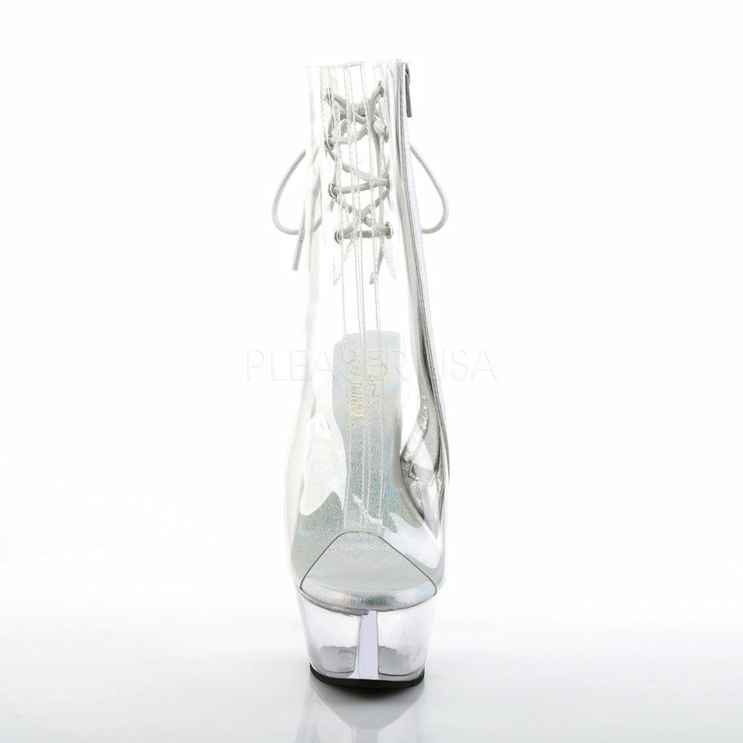 6″ (15.2cm) heel, 1 3/4″ (4.5cm) platform open toe/heel lace-up back ankle boot.