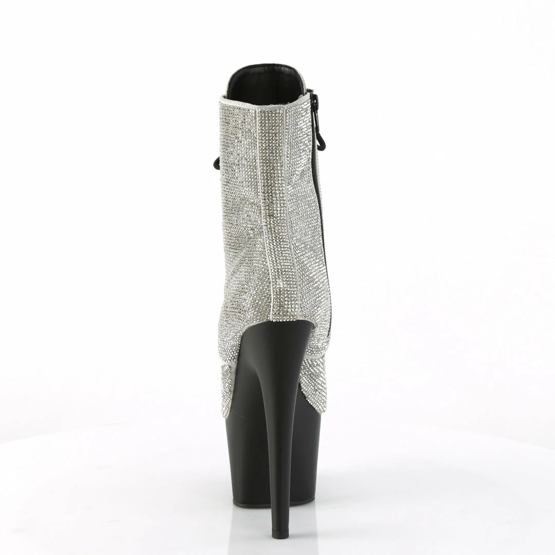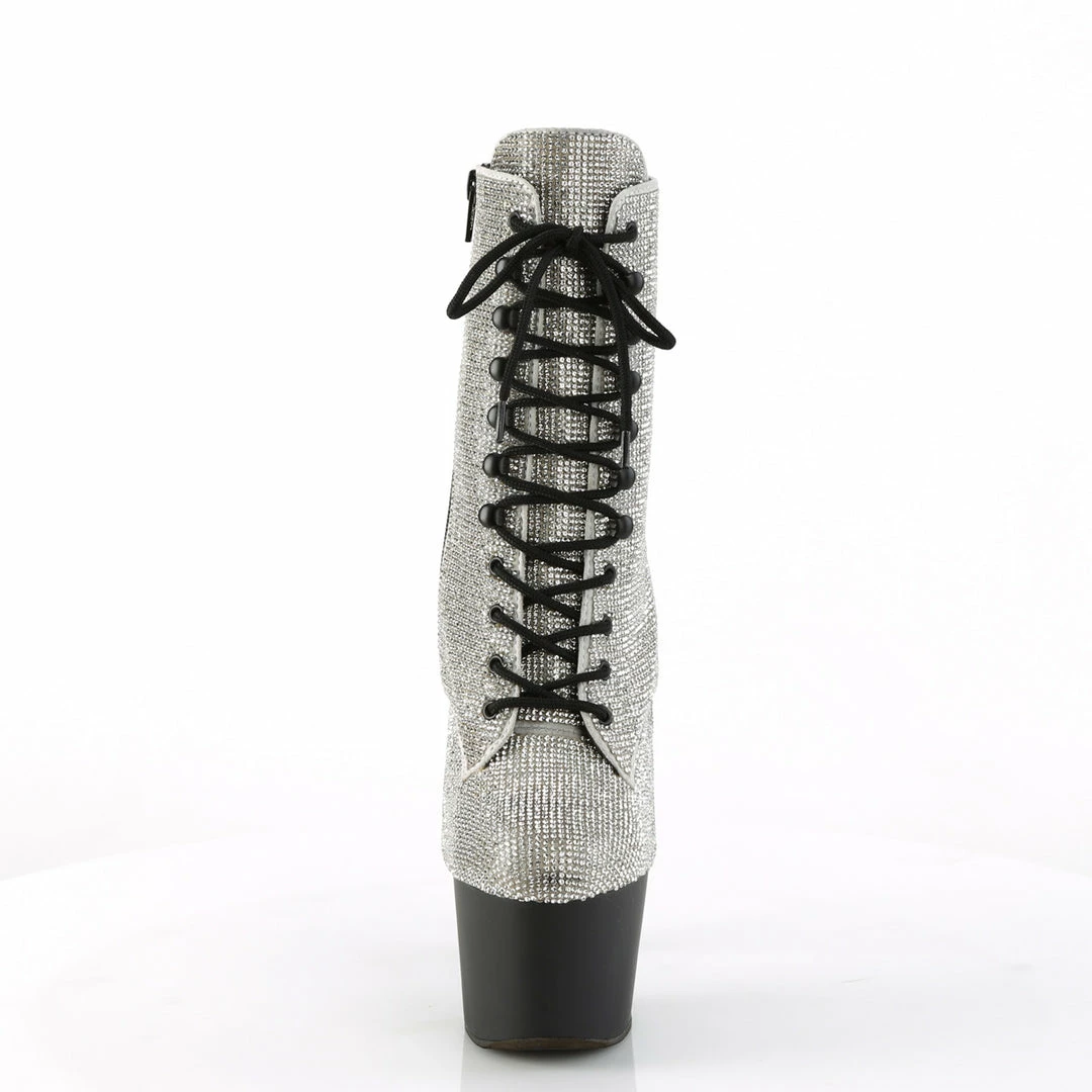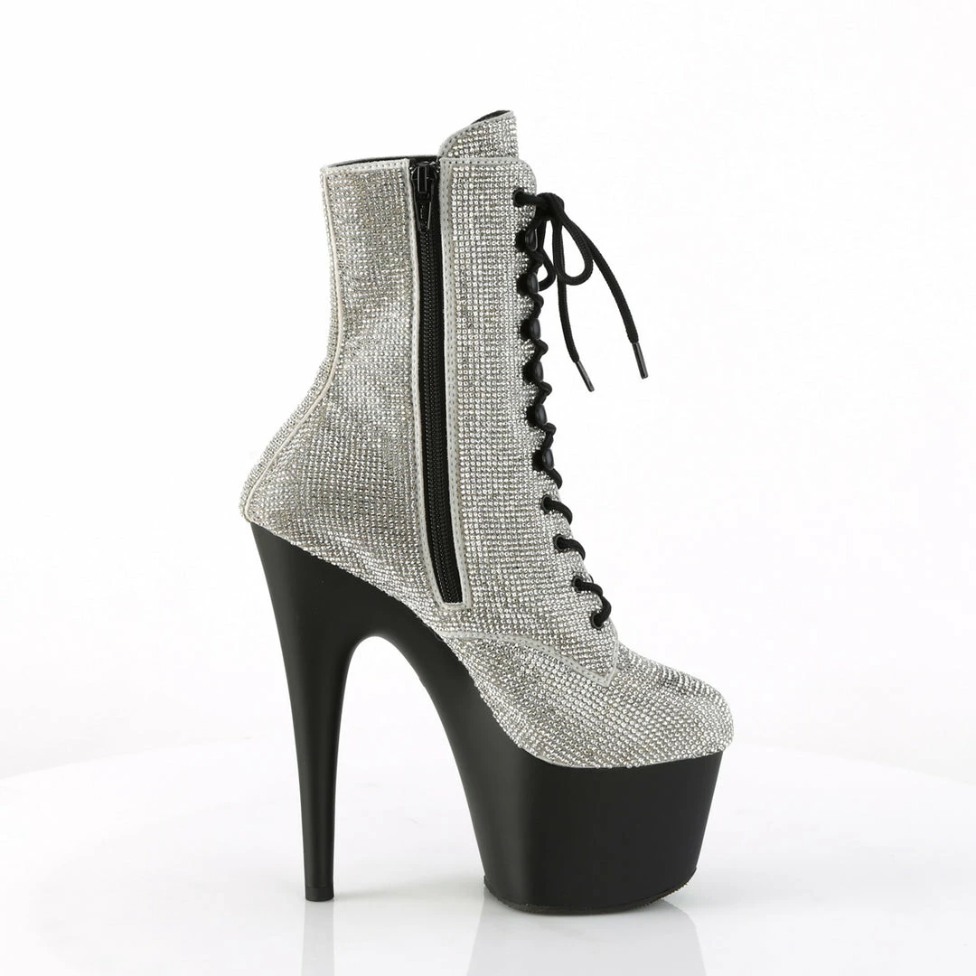 7″ (17.8cm) heel, 2 3/4″ (7cm) Platform lace-up ankle boot featuring all over blanketed rhinestone embellishments on upper, inside zip closure.