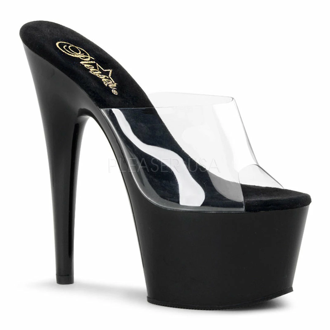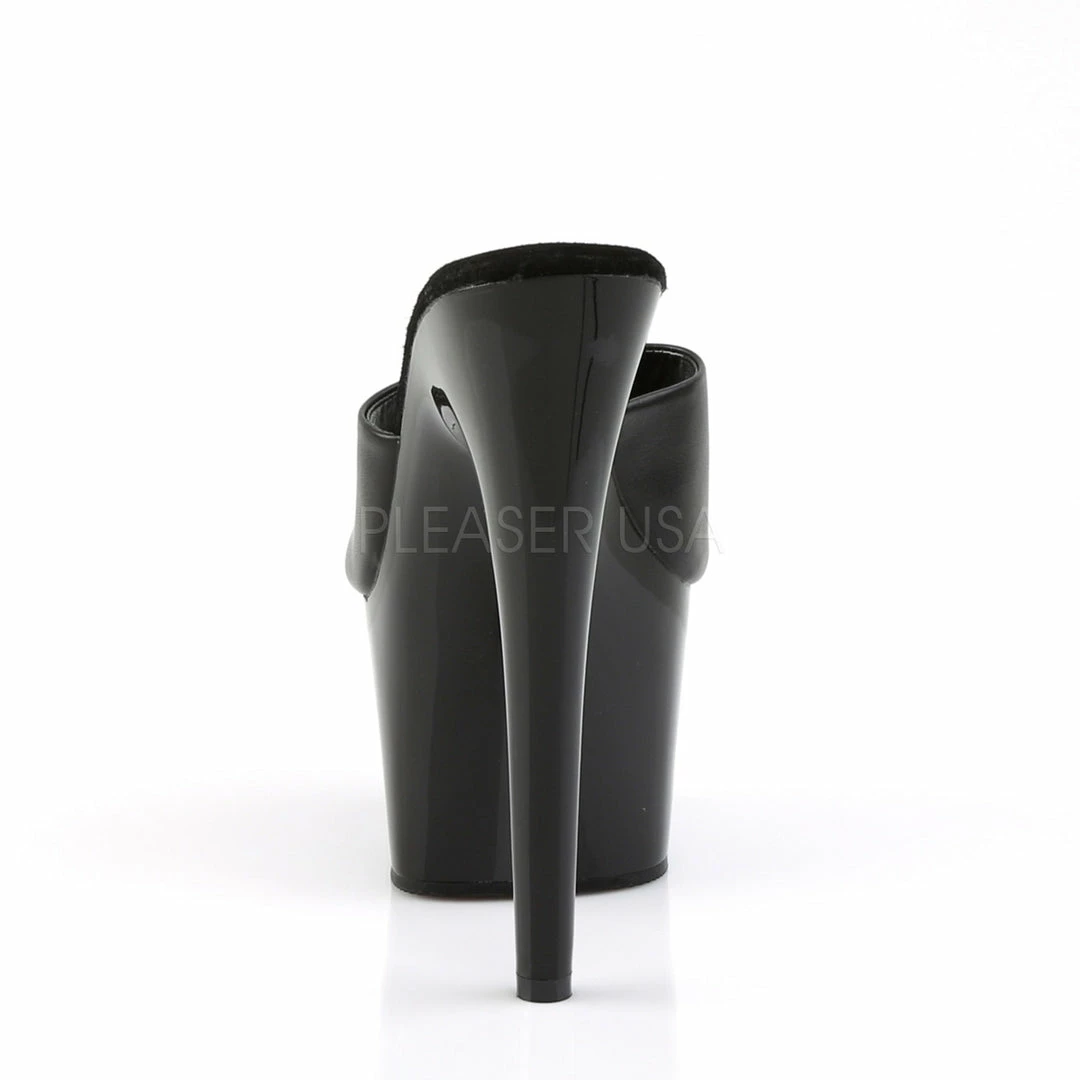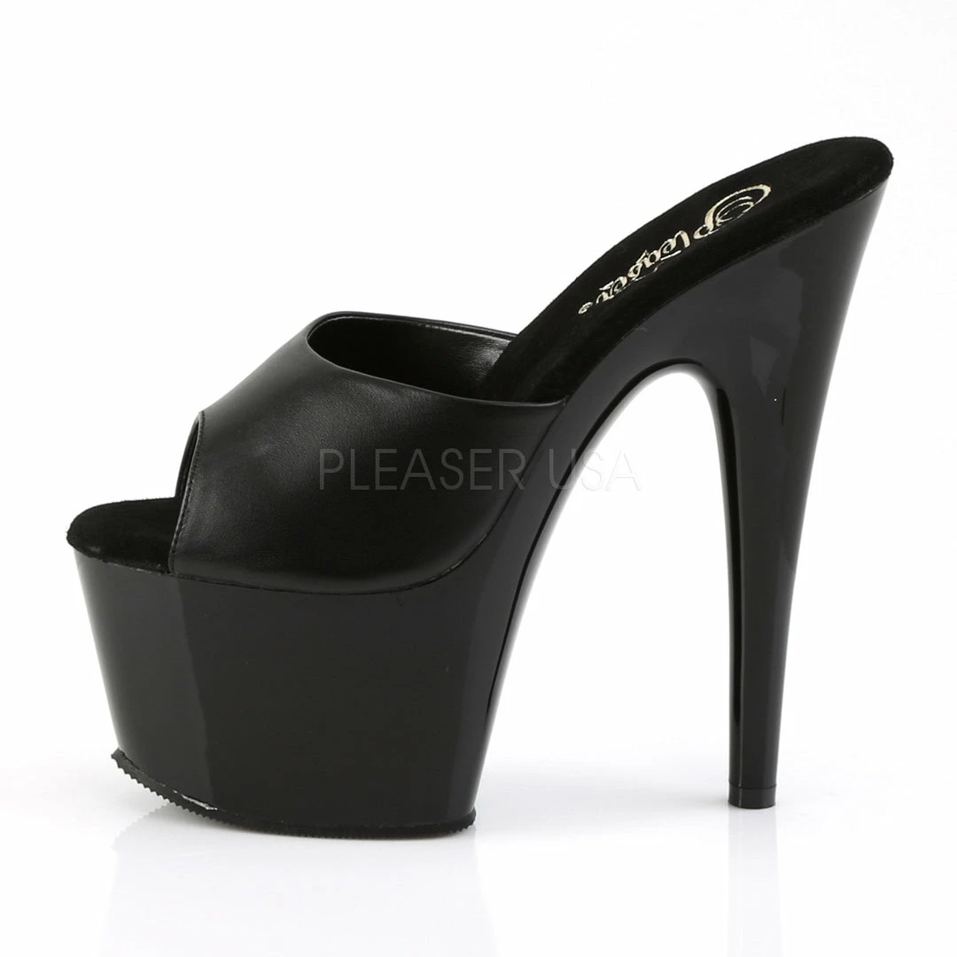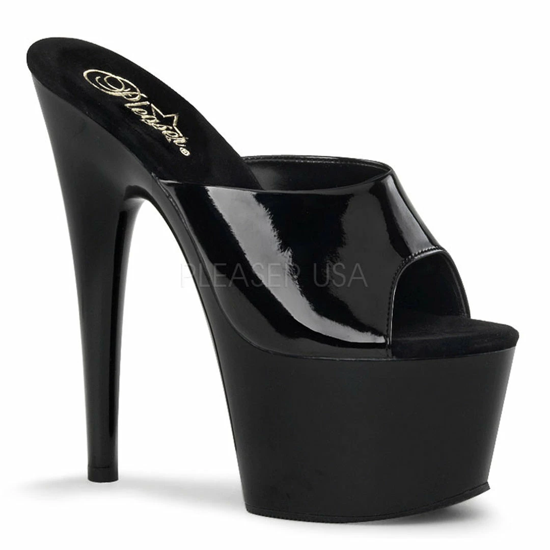7″ (17.8cm) Stiletto heel, 2 3/4″ (7cm) platform peep toe slide.