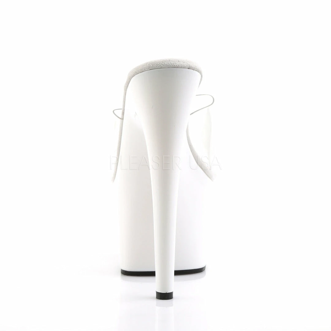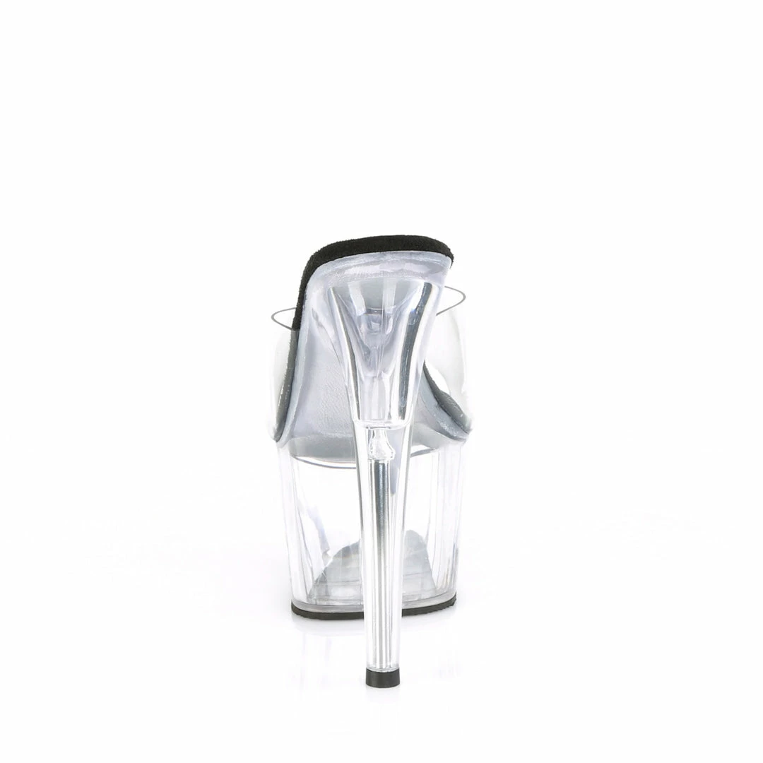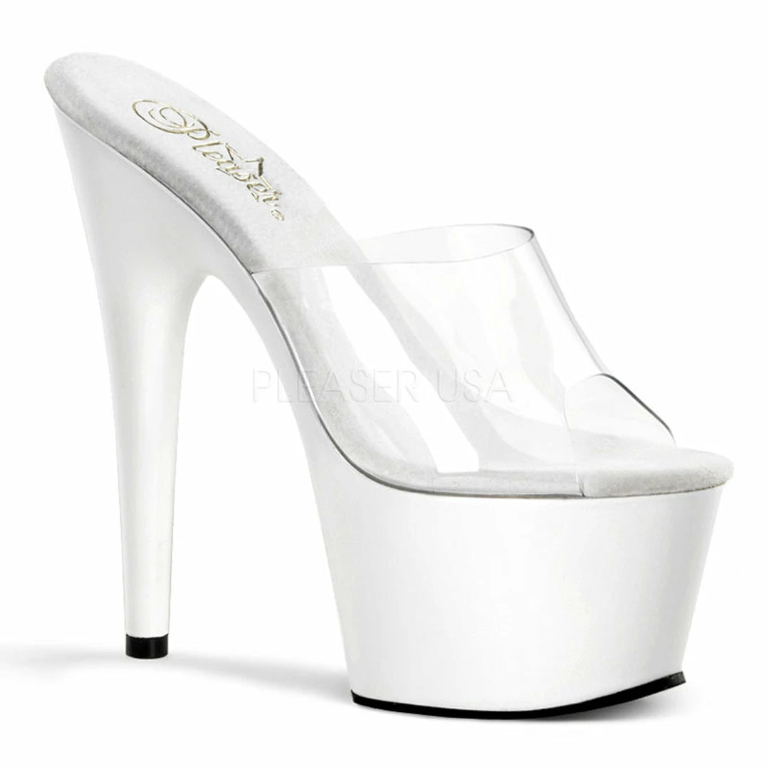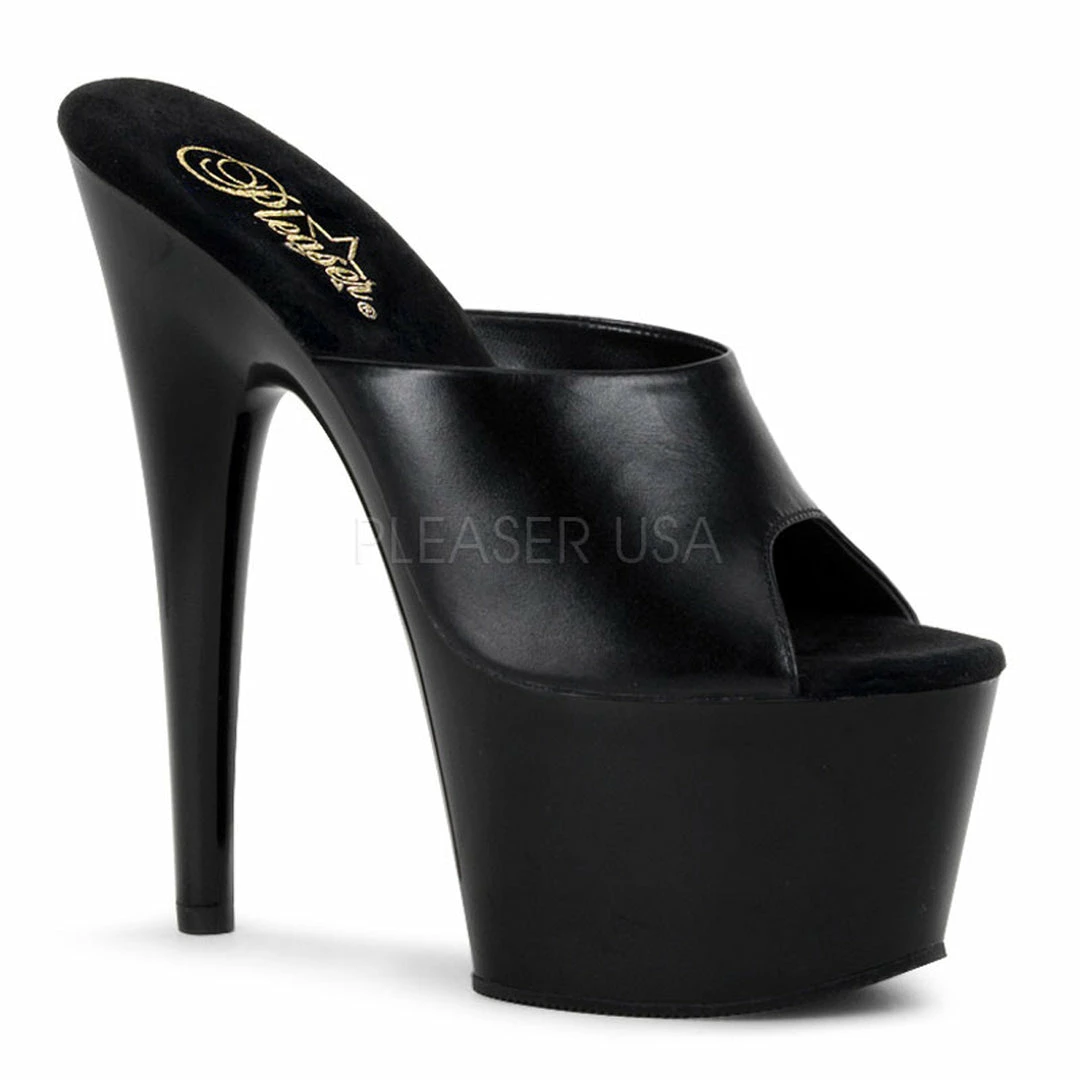 7″ (17.8cm) Stiletto heel, 2 3/4″ (7cm) platform peep toe slide.