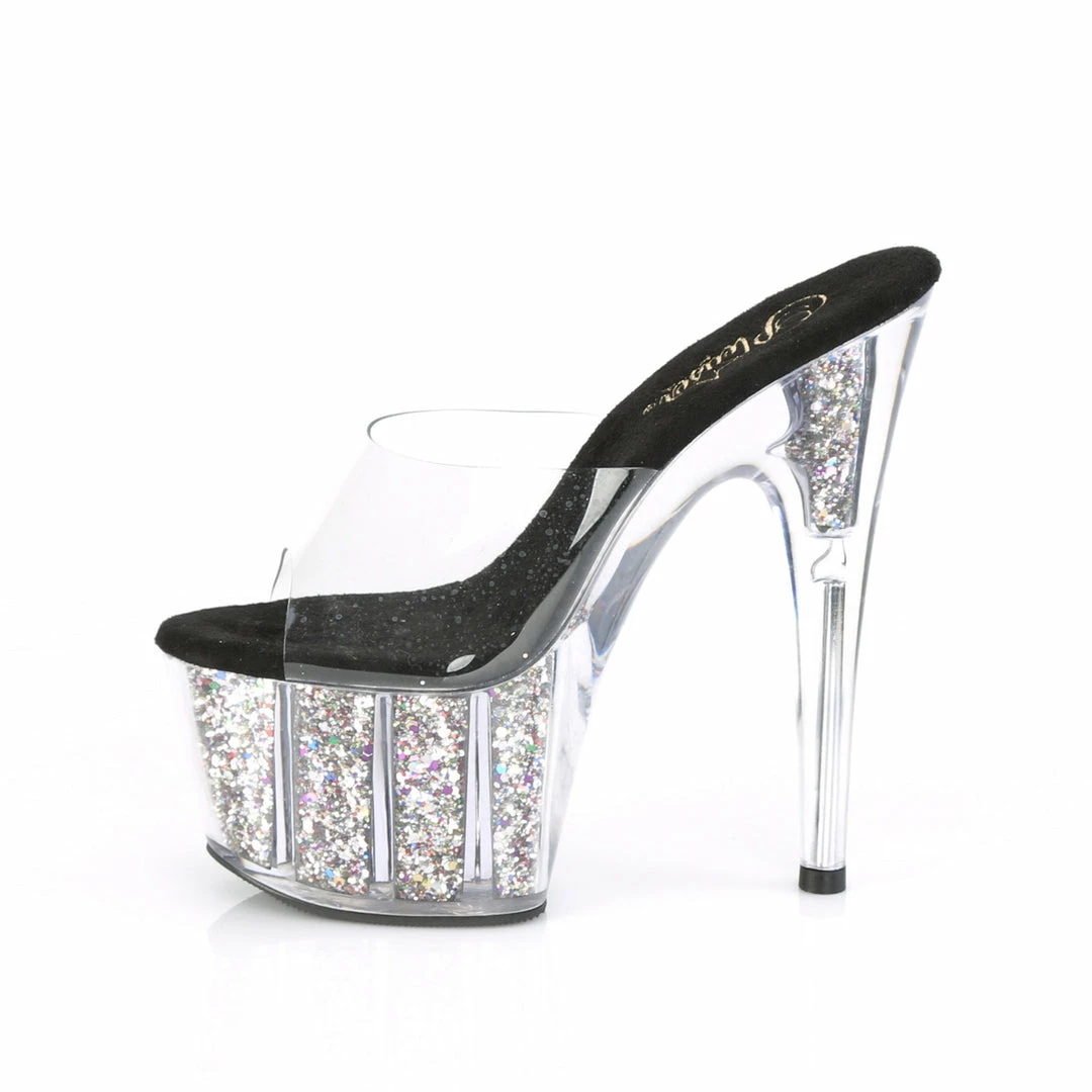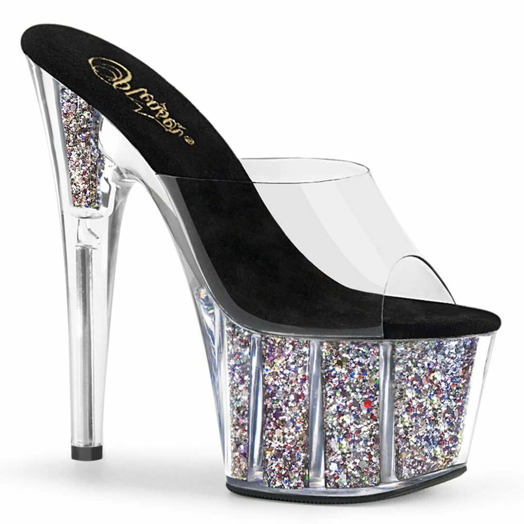7″ (17.8cm) heel, 2 3/4″ (7cm) platform slide with confetti glitter inserts in the platform bottom.